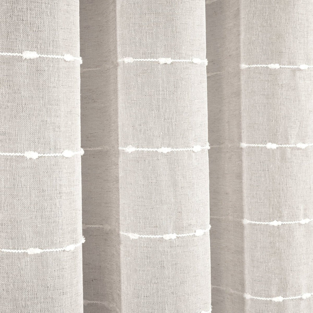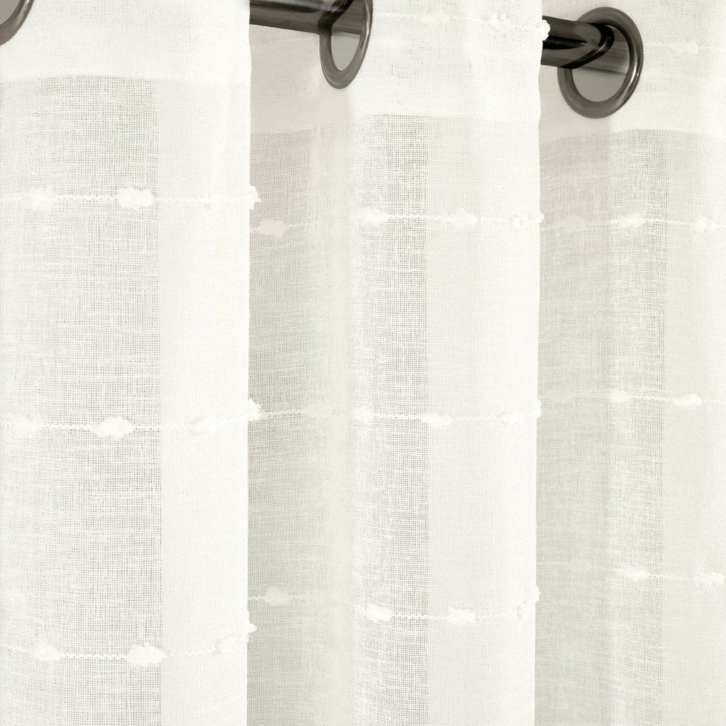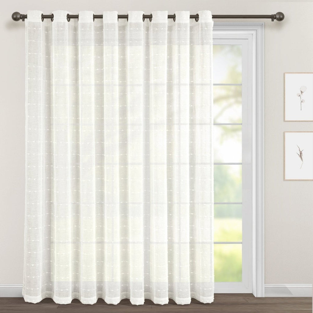 Our Farmhouse Textured Grommet Sheer Window Curtain Panel is available in multiple?áneutral color options, making it easy to match your existing decor. Each panel is 115 inches wide for very large windows or sliding doors.?áThe panels are offered in?á84 inches length?áand sold by the single panel.