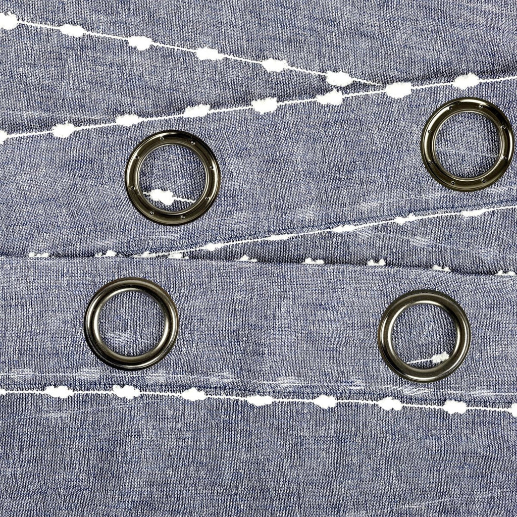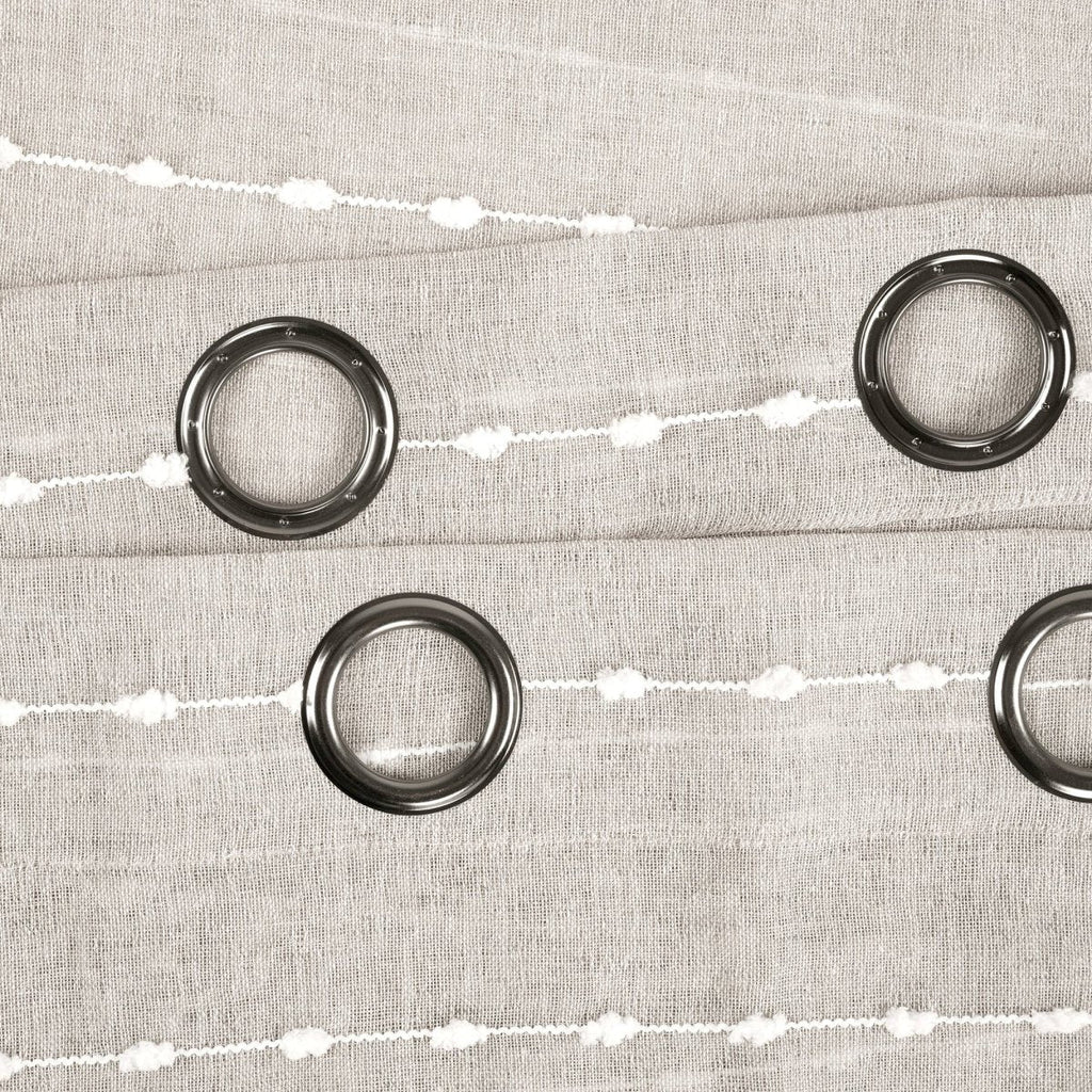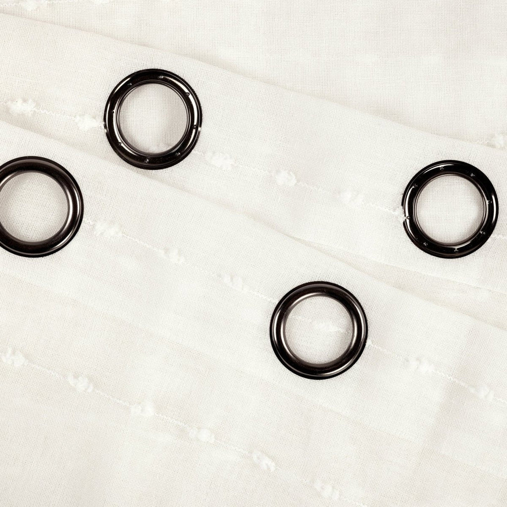Metal grommets on the Farmhouse Textured Grommet Sheer Window Curtain Panel slide onto the curtain rod for simple installation. The grommets measure about 1.6 inches in diameter and are gun metal color.