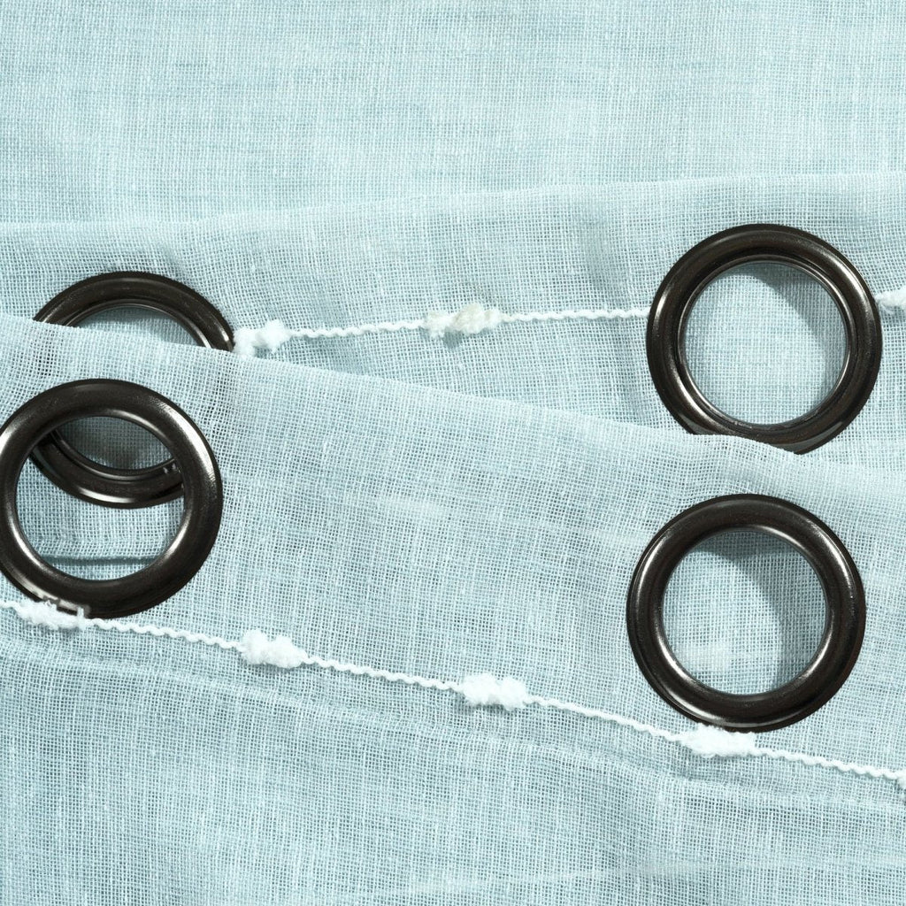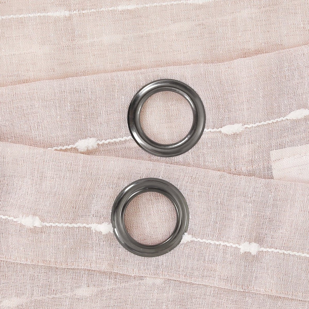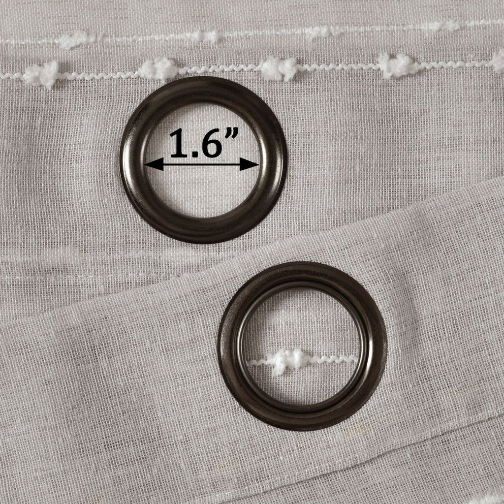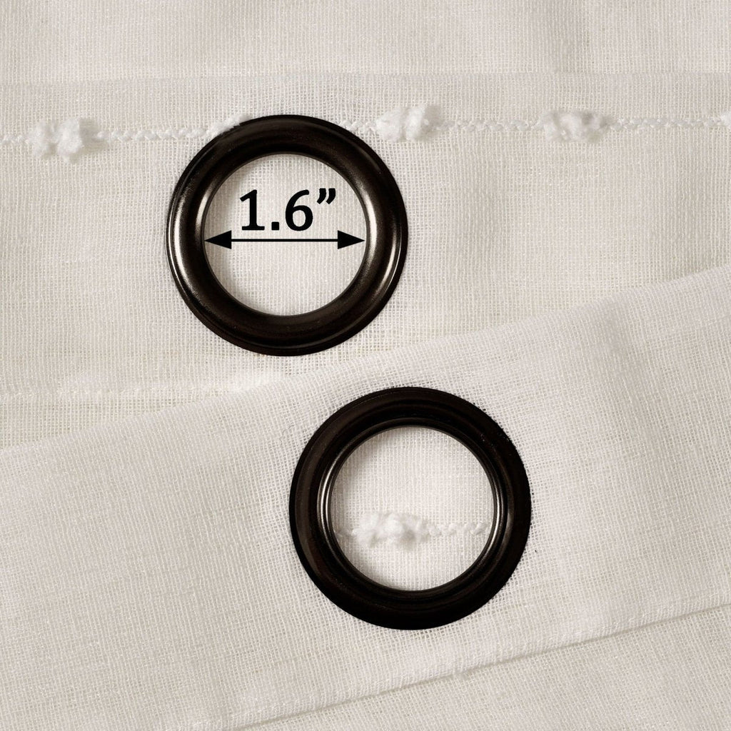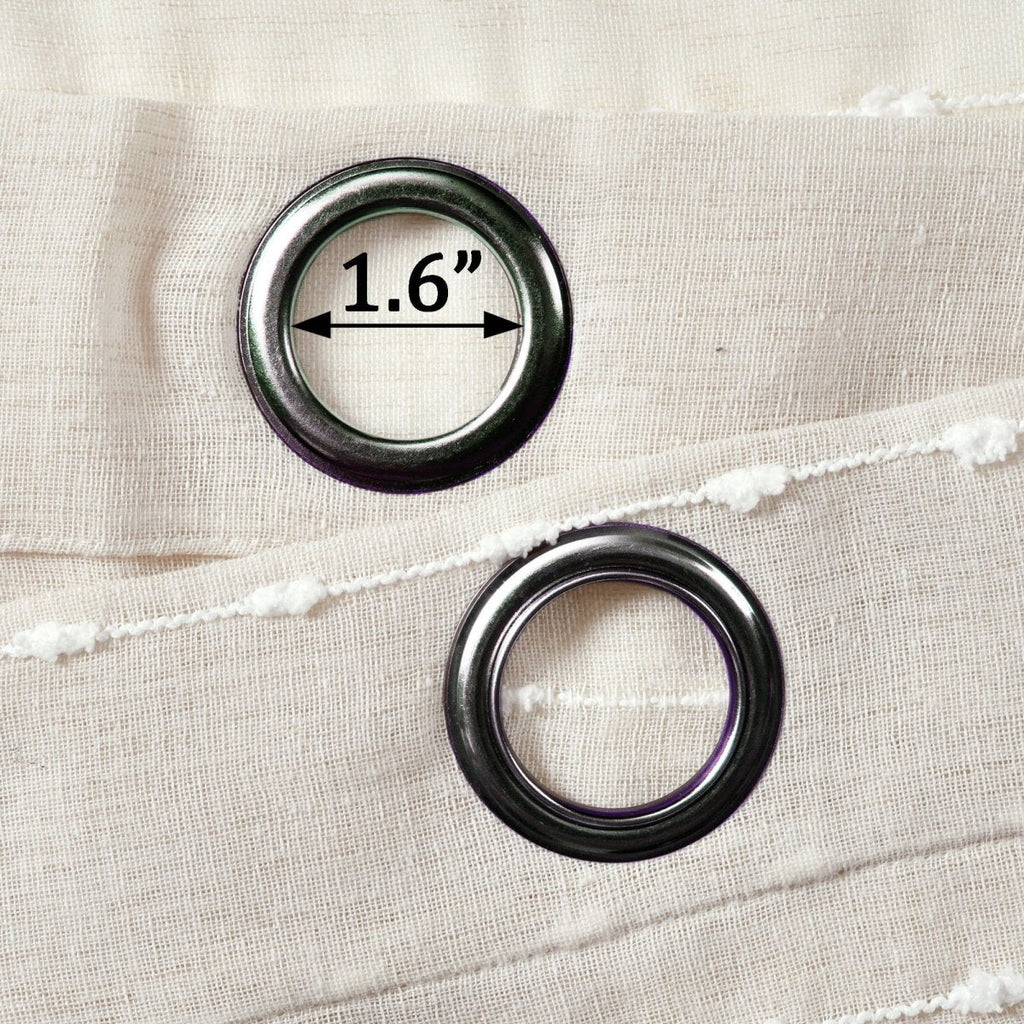 Metal grommets on the Farmhouse Textured Sheer Window Curtain Panel Set slide onto the curtain rod for simple installation. The grommets measure about 1.6 inches in diameter.
