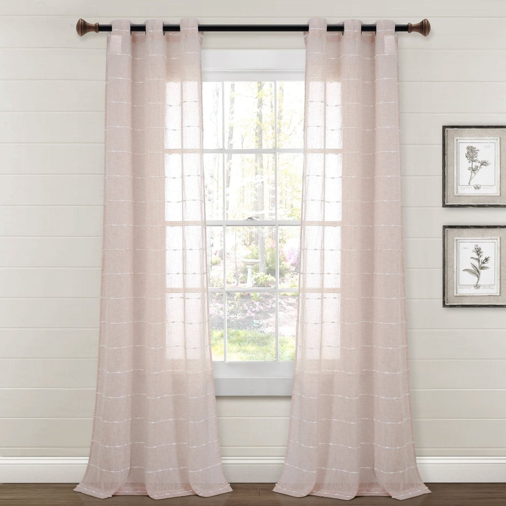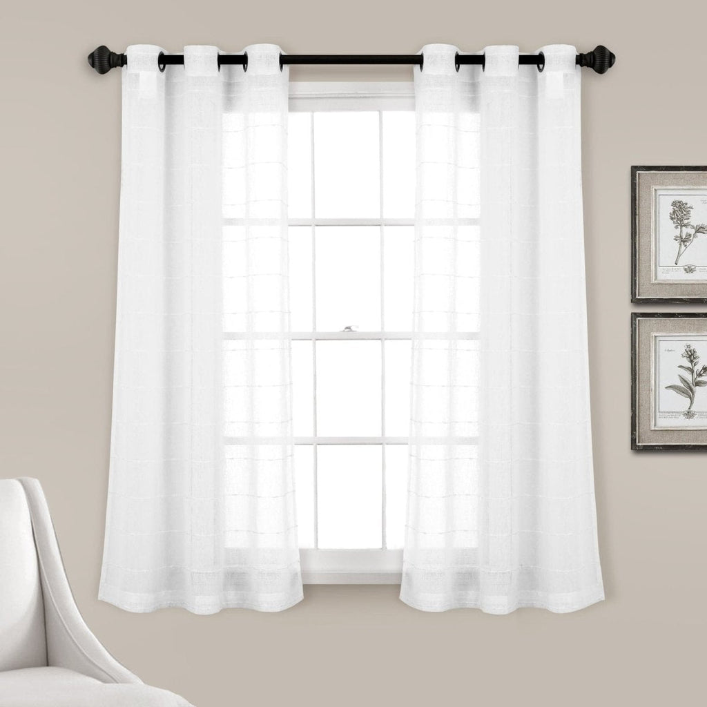 Our Farmhouse Textured Grommet Sheer Window Curtain Panel Set is available in multiple color options, including white, gray, brown, dark gray, blush, beige,?ápure white, navy, neutral and blue. Each panel is 38 inches wide and available in your choice of 63 inches, 84 inches, 95 inches, 108 inches or 120 inches in length. This curtain style is sold by the pair, so you will receive two panels per order. Some color options may not be offered in every size.