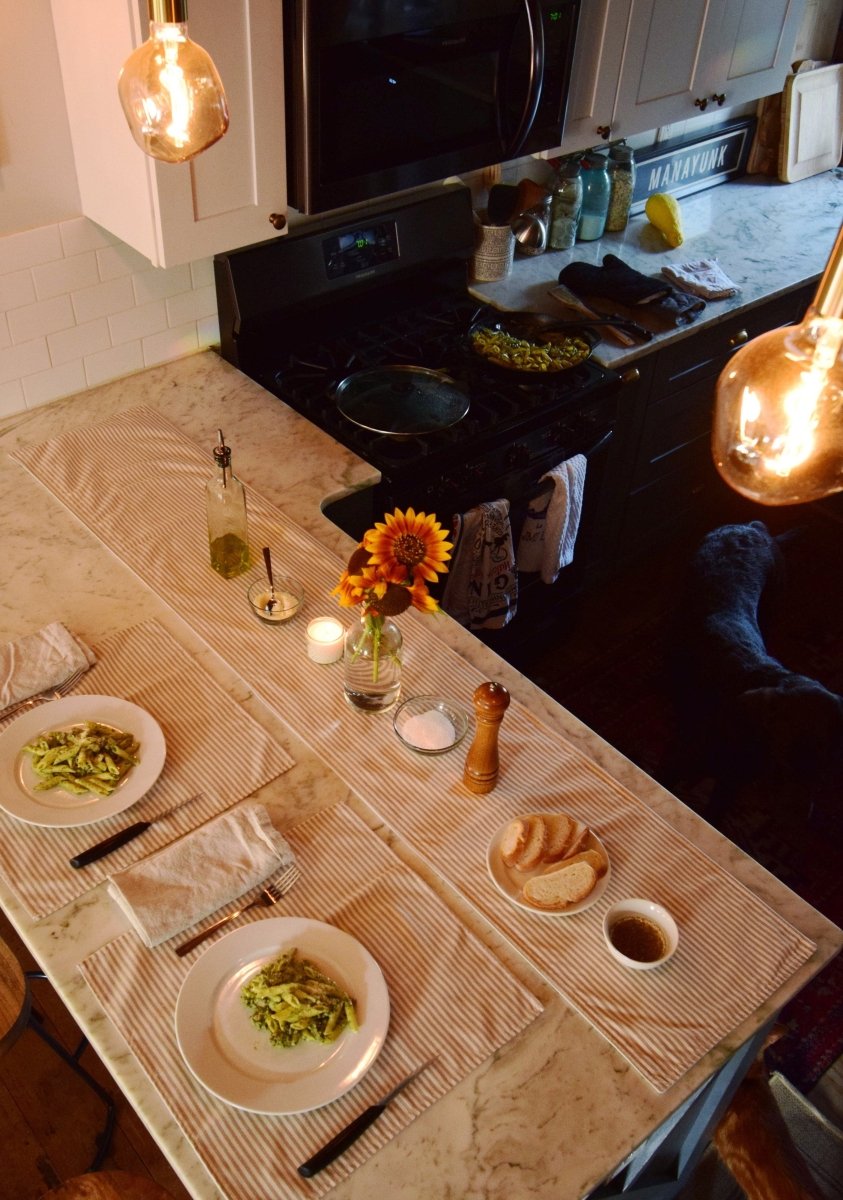 Pair this Farmhouse Ticking Stripe Yarn Dyed Table Runner with our matching Tablecloth, Napkin Set, Chair Pads and/or Placemats for a complete and coordinated look. These items make excellent housewarming gifts for anyone moving into their first apartment or any new home.