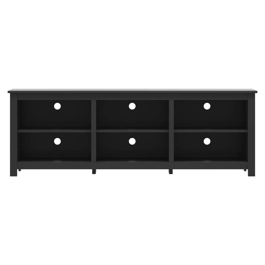 This Farmhouse TV Stand in Black Wood Finish - for TVs up to 70-inch offers a stylish and practical solution for your living room or den. Designed to accommodate TVs up to 70", it's crafted from engineered wood, offering a range of color options to fit your decor. With six open compartments, you can display your favorite books and decor items while keeping everything organized. The single cabinet with three interior shelves provides additional storage for media devices or games. Plus, the cable management system helps keep your space tidy by corralling those pesky wires. The natural venting ensures your electronics stay cool, making this stand a functional centerpiece for your entertainment area.