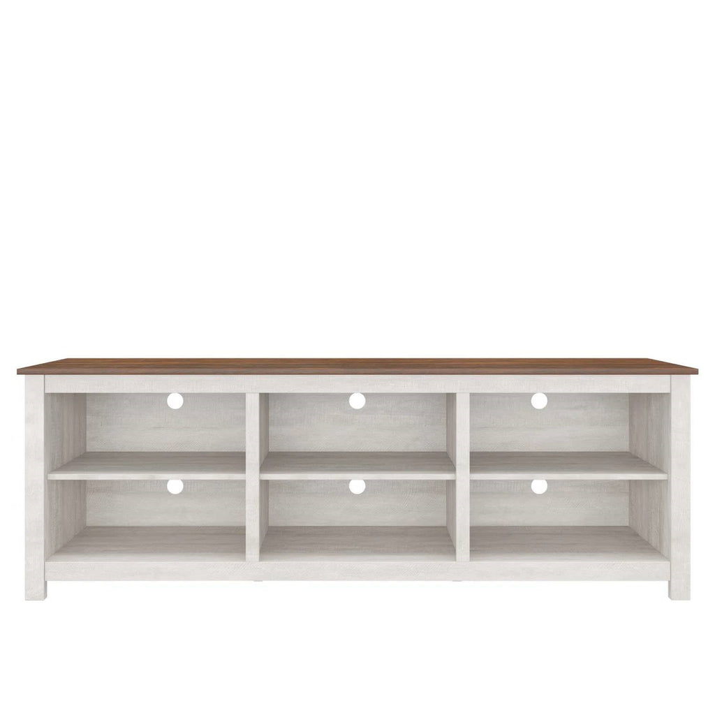 This Farmhouse TV Stand in Grey Oak with Brown Wood Finish Top for TVs up to 70-inch offers a stylish and practical solution for your living room or den. Designed to accommodate TVs up to 70", it's crafted from engineered wood, offering a range of color options to fit your decor. With six open compartments, you can display your favorite books and decor items while keeping everything organized. The single cabinet with three interior shelves provides additional storage for media devices or games. Plus, the cable management system helps keep your space tidy by corralling those pesky wires. The natural venting ensures your electronics stay cool, making this stand a functional centerpiece for your entertainment area.