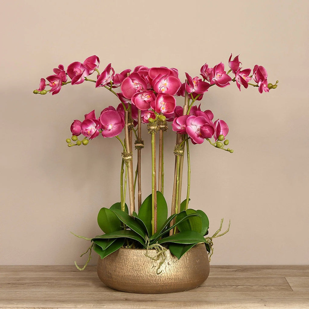 Classic faux floral arrangement displaying pink orchids in a stunning gold ceramic planter, making them a rich addition to your home décor.