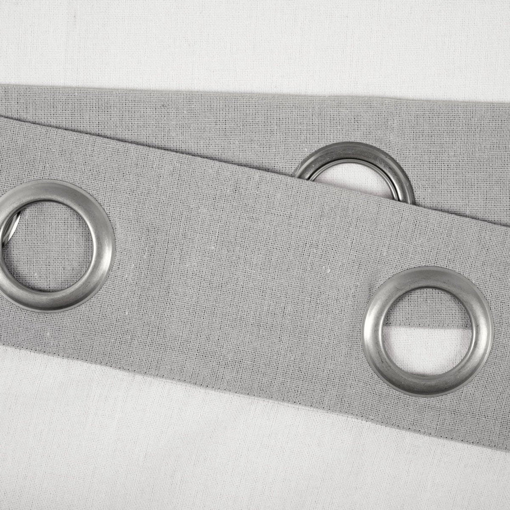 The Faux Linen Grommet Color Block Window Curtain Panel hangs easily with metal grommets that measure about 1.6 inches in diameter. Simply slide the rod through the grommets.