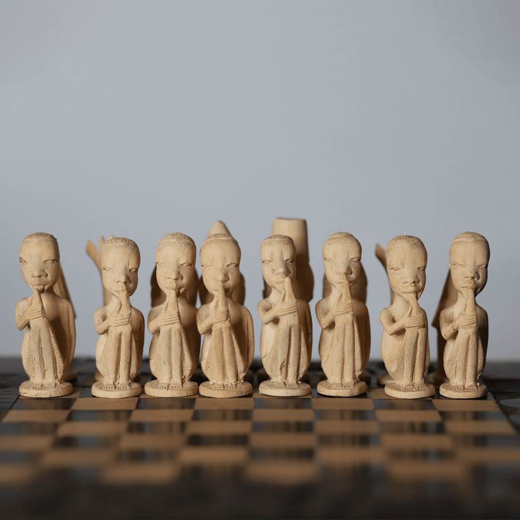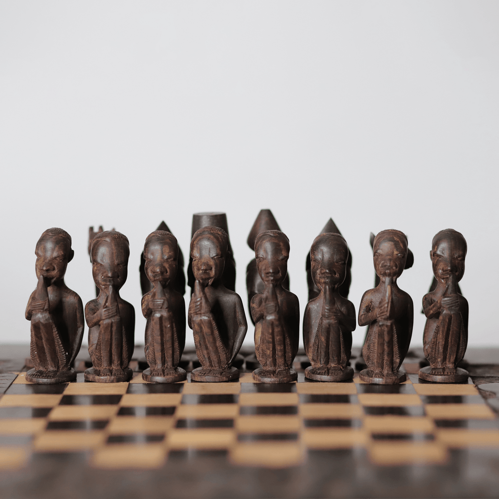 Hand carved one of a kind African flute player chess pieces. The dark pieces are made out of 100% Tanzanian ebony wood and the lighter chess pieces are made out of 100% Tanzanian teak wood.