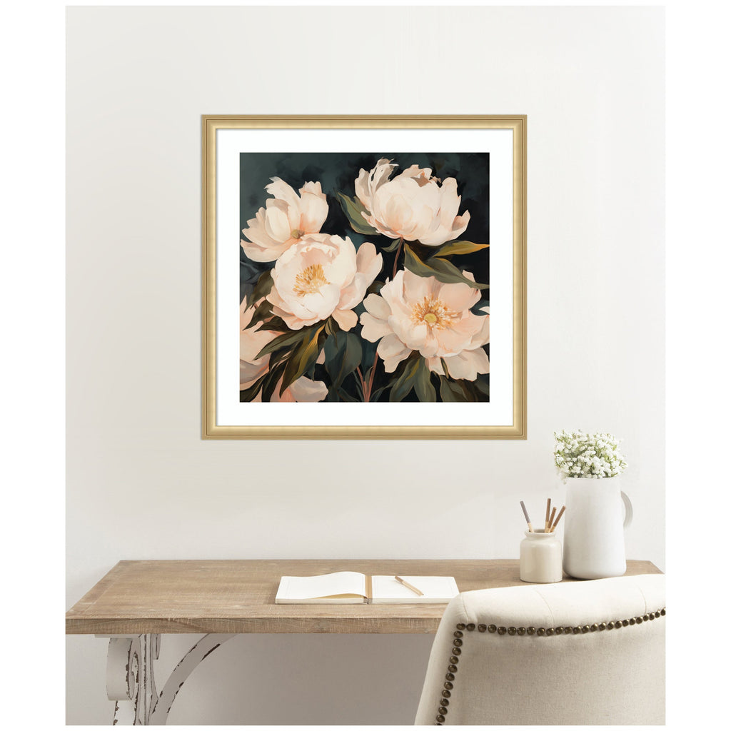 Elevate your space through thoughtfully curated style with this stunning piece designed by independent artist The Creative Bunch Studio and beautifully framed by hand in Madison, WI. The image is giclee printed using fade-resistant inks, ensuring every detail comes to life in rich, lasting color. Set in designer moulding, its a Traditional accent crafted to make a statement. Visual Story: The artwork depicts a lush arrangement of peonies in full bloom against a dark background. The flowers are painted in soft, delicate hues of white and peach, showcasing their intricate petals and lush leaves. The contrast of light and dark enhances the elegance and romantic feel of the piece.