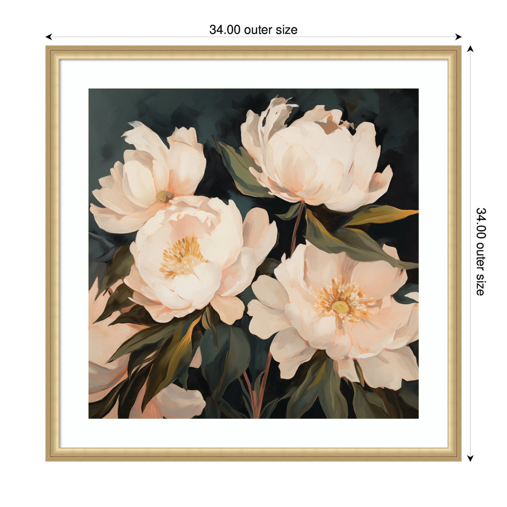 - Authentic Artist Collaboration: 'Beautiful Painterly Floral Bouquets 2' is an officially licensed work by independent artist The Creative Bunch Studio, thoughtfully presented in our Florence Gold molding. The finished piece measures 34 x 34, offering a sophisticated statement for your space. Visual Story: The artwork depicts a lush arrangement of peonies in full bloom against a dark background. The flowers are painted in soft, delicate hues of white and peach, showcasing their intricate petals and lush leaves. The contrast of light and dark enhances the elegance and romantic feel of the piece. The Creative Bunch Studio's Artist Profile: A Wisconsin family collective that mixes media and styles, the group creates upbeat artwork rooted in mutual encouragement and fun.