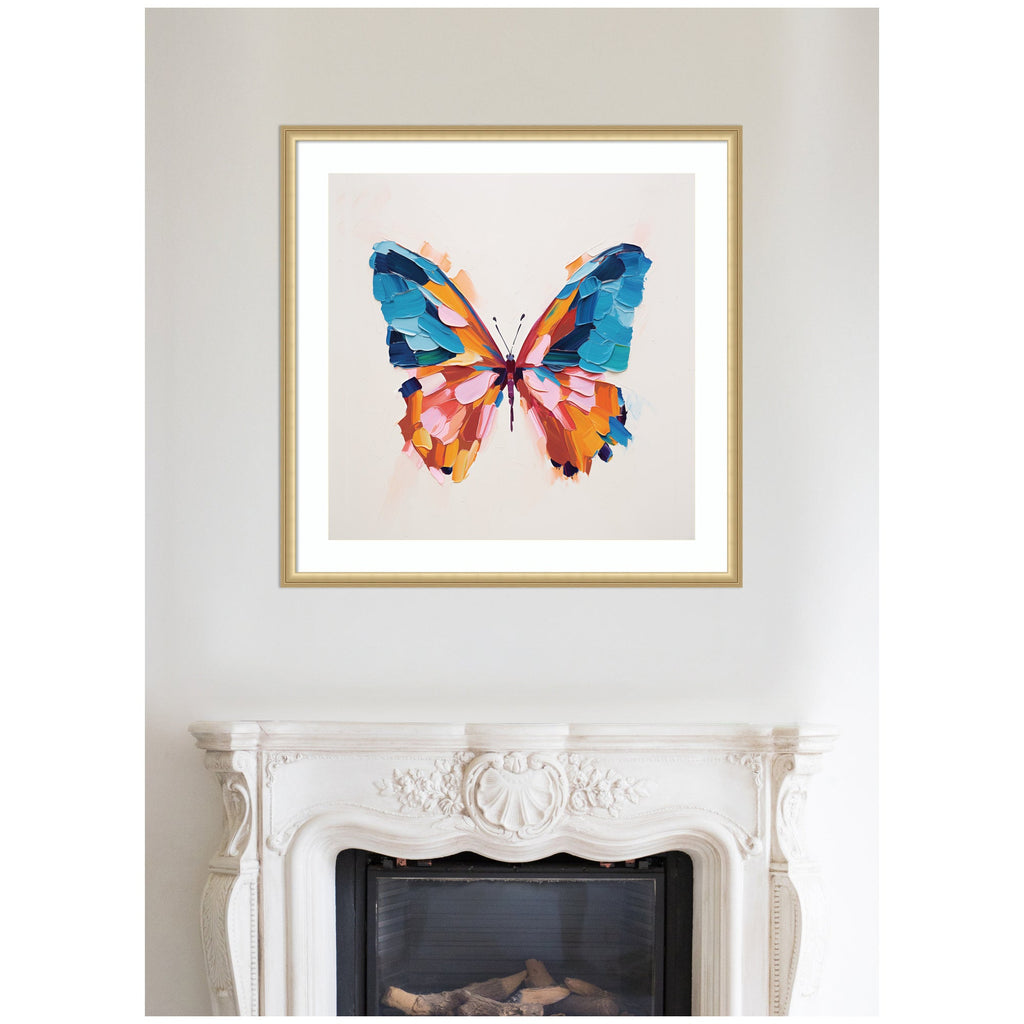 Elevate your space through thoughtfully curated style with this stunning piece designed by independent artist The Creative Bunch Studio and beautifully framed by hand in Madison, WI. The image is giclee printed using fade-resistant inks, ensuring every detail comes to life in rich, lasting color. Set in designer moulding, its a Bohemian Boho accent crafted to make a statement. Visual Story: The artwork depicts a butterfly with vibrant and bold colors using thick, textured brushstrokes. The wings are composed of an array of hues, including blues, oranges, and pinks, creating a dynamic and lively visual effect. The abstract style emphasizes the beauty and complexity of nature.