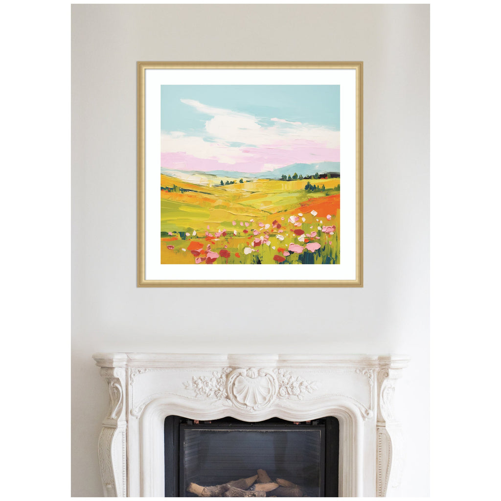 Elevate your space through thoughtfully curated style with this stunning piece designed by independent artist The Creative Bunch Studio and beautifully framed by hand in Madison, WI. The image is giclee printed using fade-resistant inks, ensuring every detail comes to life in rich, lasting color. Set in designer moulding, its a Whimsical accent crafted to make a statement. Visual Story: The artwork depicts a vibrant landscape with colorful wildflowers in the foreground, rolling fields, and a bright sky above. The use of bold, textured brushstrokes brings an impressionistic style to the scene, evoking a sense of tranquility and beauty. The composition captures the essence of a peaceful countryside setting.