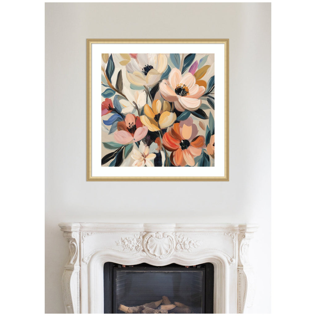 - Authentic Artist Collaboration: 'Garden Bloom Abstract Bouquet II' is an officially licensed work by independent artist The Creative Bunch Studio, thoughtfully presented in our Florence Gold molding. The finished piece measures 34 x 34, offering a sophisticated statement for your space. Visual Story: This artwork features a vibrant and abstract depiction of flowers, with bold brushstrokes and a lively color palette. The composition showcases various blossoms in shades of pink, orange, and cream, surrounded by broad leaves. The pieces exude a sense of movement and energy, capturing the essence of a flourishing garden. The Creative Bunch Studio's Artist Profile: A Wisconsin family collective that mixes media and styles, the group creates upbeat artwork rooted in mutual encouragement and fun.