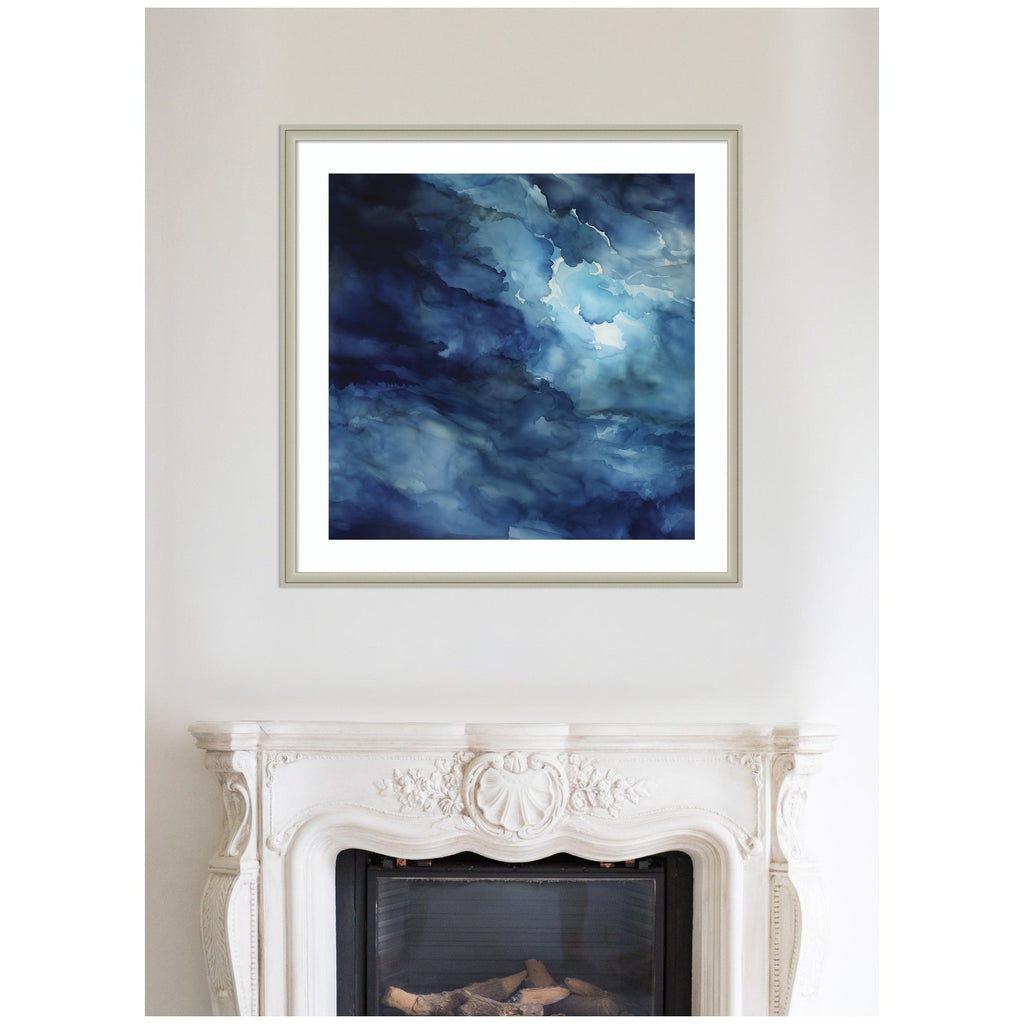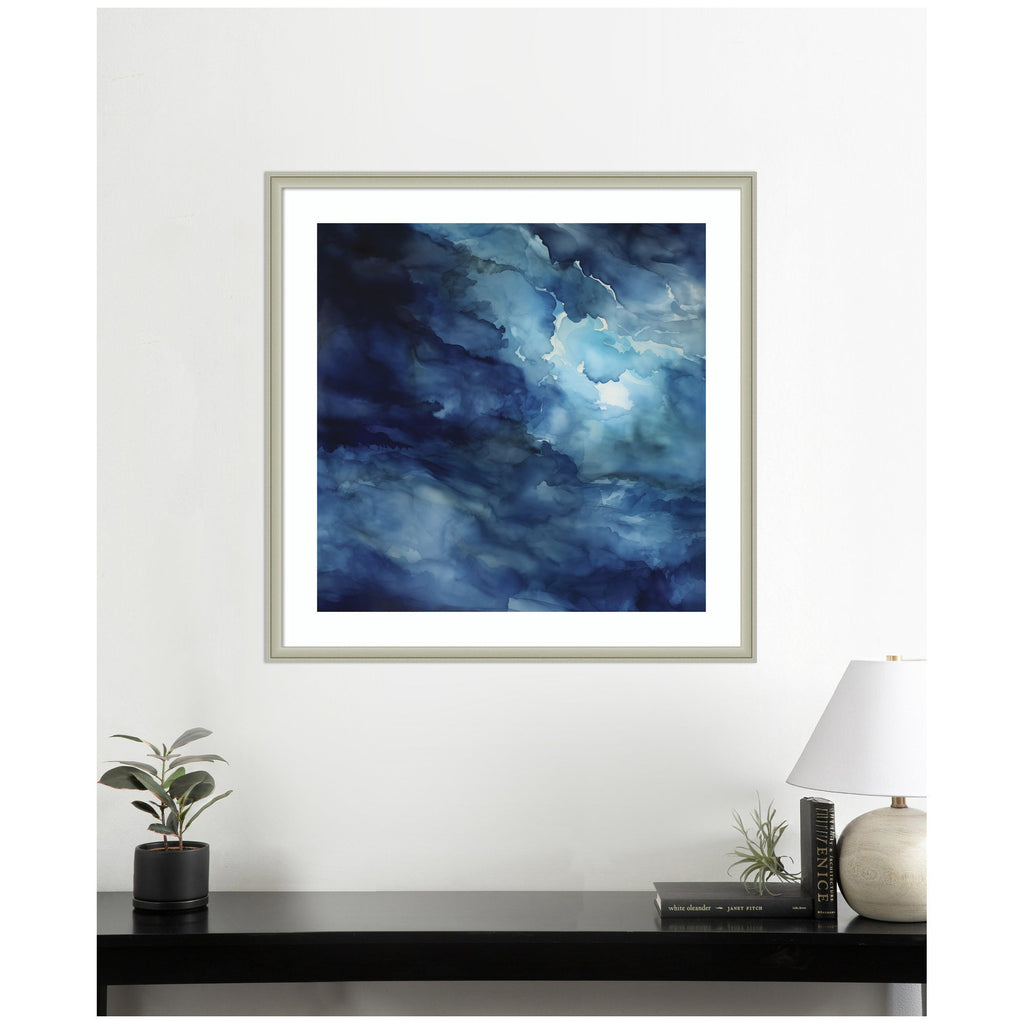 Elevate your space through thoughtfully curated style with this stunning piece designed by independent artist The Creative Bunch Studio and beautifully framed by hand in Madison, WI. The image is giclee printed using fade-resistant inks, ensuring every detail comes to life in rich, lasting color. Set in designer moulding, its a Coastal accent crafted to make a statement. Visual Story: The artwork features a dynamic interplay of deep blues and light azure, resembling swirling ocean currents or stormy skies. Its fluid and ethereal composition creates a dreamlike atmosphere. The blend of dark and light hues adds depth and movement to the piece.