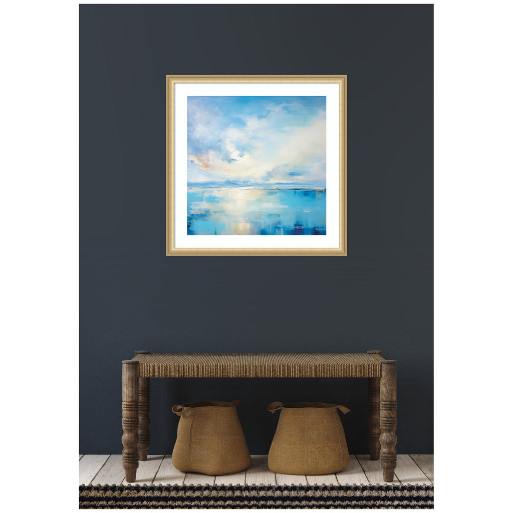 Elevate your space through thoughtfully curated style with this stunning piece designed by independent artist The Creative Bunch Studio and beautifully framed by hand in Madison, WI. The image is giclee printed using fade-resistant inks, ensuring every detail comes to life in rich, lasting color. Set in designer moulding, its a Coastal accent crafted to make a statement. Visual Story: This artwork features an ethereal seascape with a calm ocean reflecting the expansive sky. Soft clouds float above, blending seamlessly into a serene horizon. The calming blue tones create a tranquil and peaceful atmosphere.