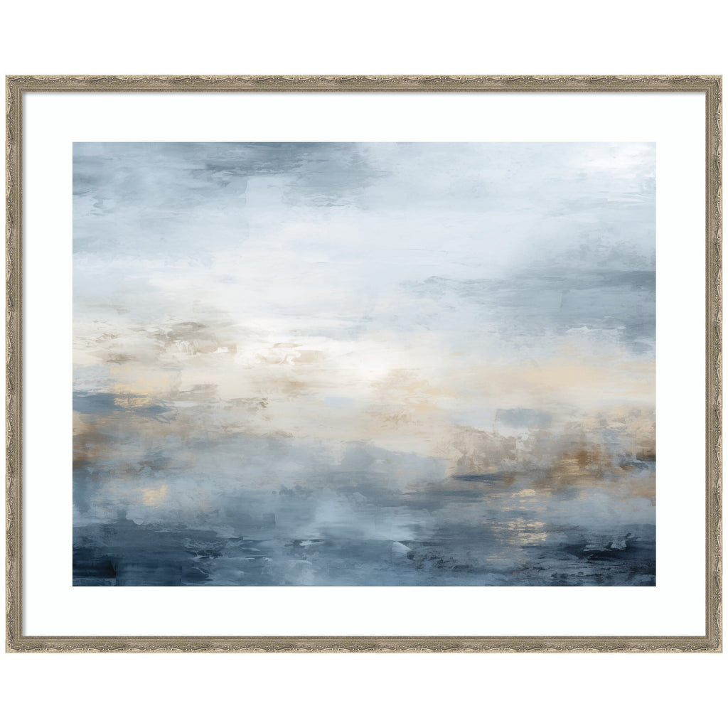 Elevate your space through thoughtfully curated style with this stunning piece designed by independent artist The Creative Bunch Studio and beautifully framed by hand in Madison, WI. The image is giclee printed using fade-resistant inks, ensuring every detail comes to life in rich, lasting color. Set in designer moulding, its a Coastal accent crafted to make a statement. Visual Story: The image features an abstract representation of a serene landscape, with a gentle mix of blues and beiges. There's a sense of calm evoked by the soft blending of colors that suggest a horizon reflecting on water. The textured brushstrokes create a soothing, tranquil atmosphere.