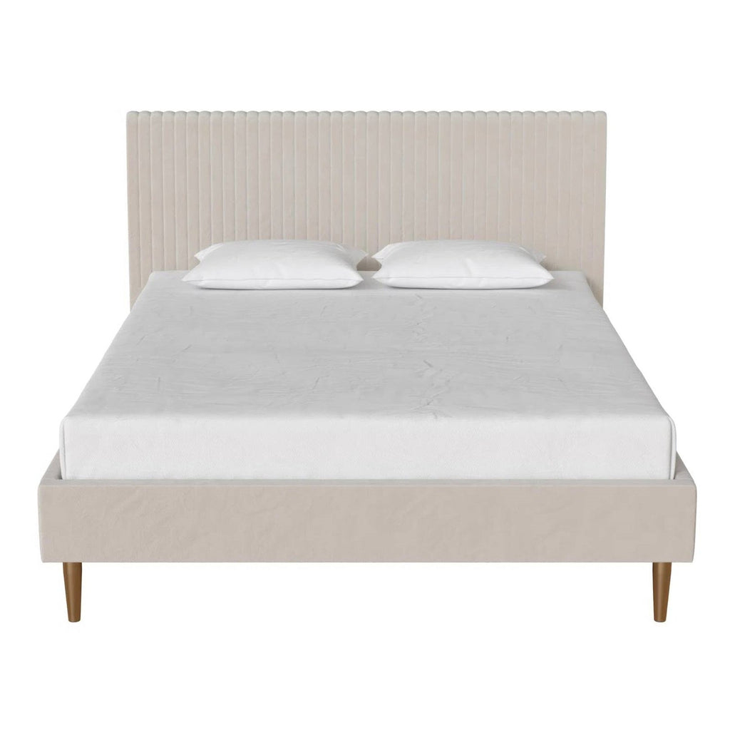 The Full size Off-White Ivory Cream Upholstered Platform Bed Frame with Headboard doesn’t take itself too seriously but it also doesn’t mind being the center of attention. With its richly hued soft-to-the-touch upholstery, detailed vertical channel-tufted headboard, and brass-toned tapered metal legs, the Platform Bed sets the stage for a memorable design experience. It combines its ultra-luxe sensibilities with a serene slimline profile that is bound to maximize the look of any tightly spaced bedroom. Sleep in comfortable bliss knowing that the Platform Bed has been well-built with a sturdy wooden frame that features a secured bentwood slat system, metal side rails, and strong center legs. Offered in several opulent shades, the Platform Bed will serve as an anchor piece, confident enough to allow your indulgence in those DIY passion projects that will completely transform your room from bland to modern-day glam. So start sprinkling some of that fairy dust!