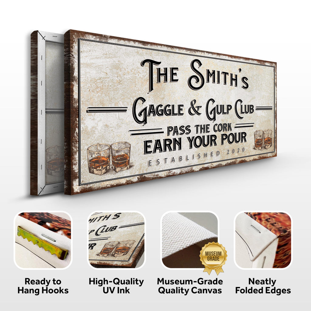 Looking for a way to add some personality to your bar relaxation space? Look no further than our Gaggle & Gulp Club Sign canvas wall art! This bar sign is the perfect way to personalize your space and make it your own. This sign will turn heads and get people talking with its vintage-inspired design.