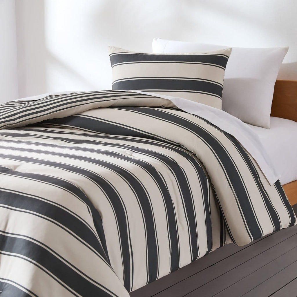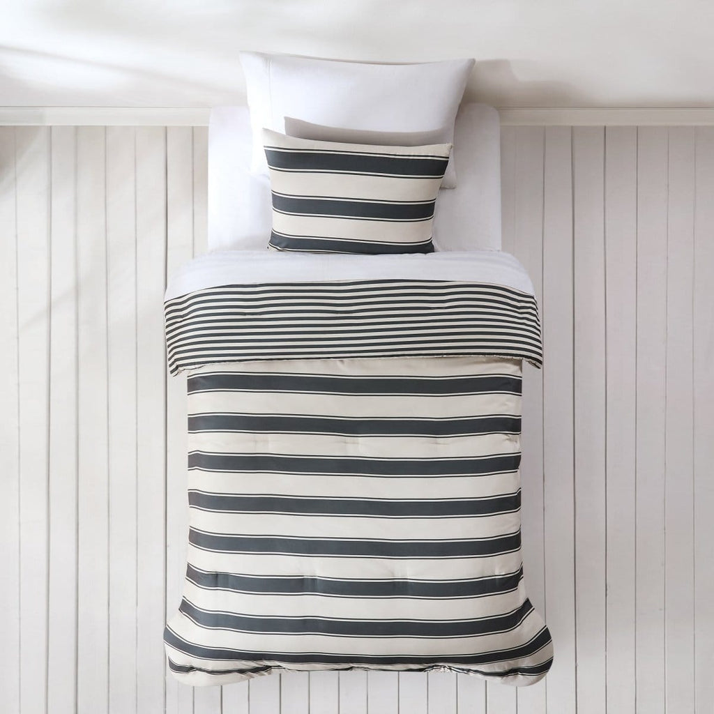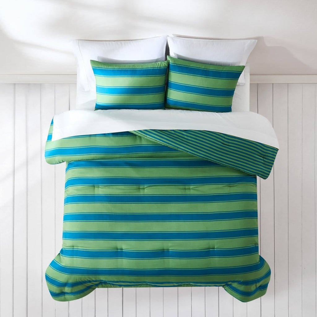 Get into vacation mode with this coastal-cool striped comforter set. Bold cabana-style stripes and a reversible design bring sunny, retro charm to any bedroom — from primary to guest to dorm.