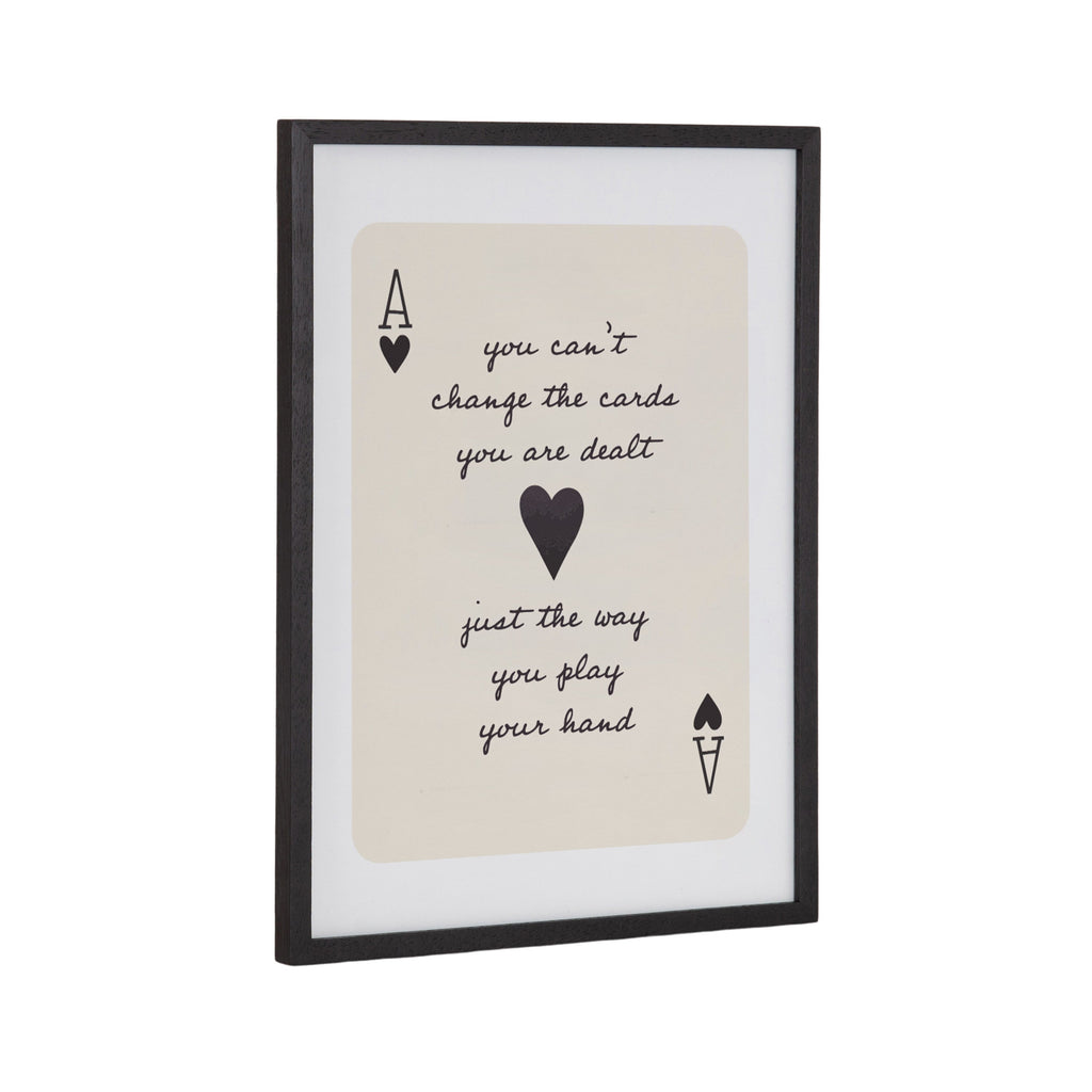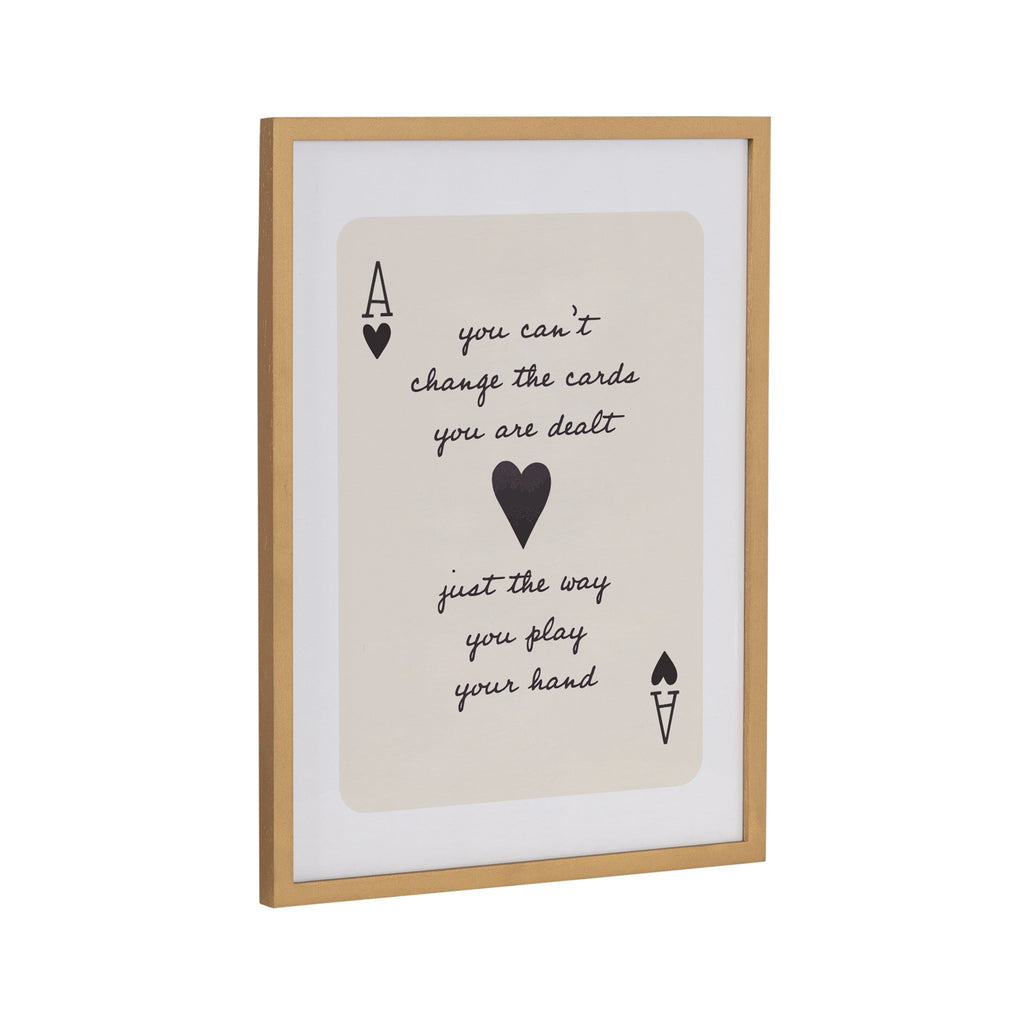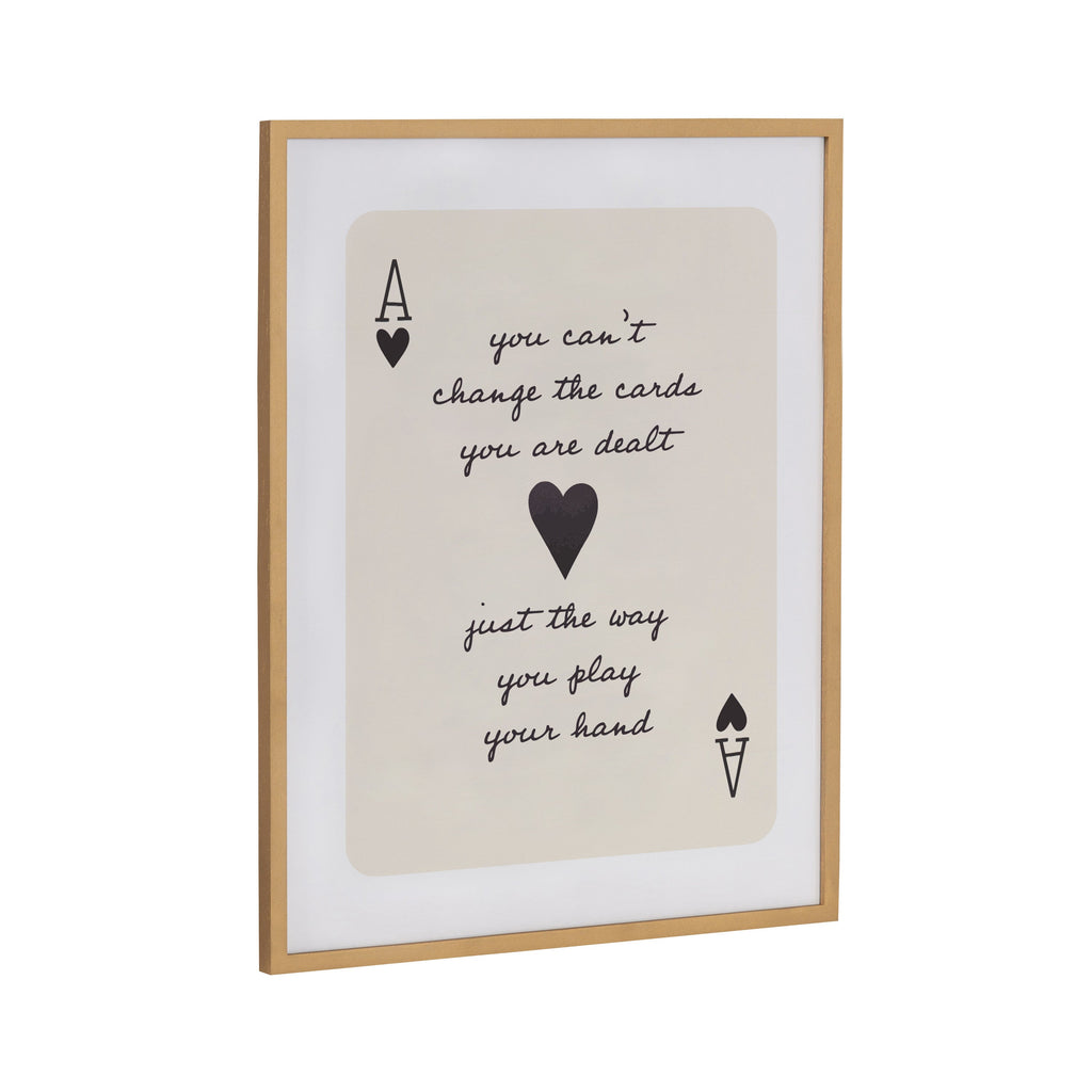 The Ace of Hearts artwork serves as a playful backdrop for an inspirational quote in this modern piece. Printed in the USA in Waunakee, Wisconsin, this modern framed wall art is sure to bring joy to your space. Our design team curates art that will fit perfectly in any room of your home. Printed on semi-gloss paper made of responsibly sourced wood fibers and framed with a simple solid wood gallery frame, this wall art is easy to display on the wall and will match any décor style. Showcase this curated art in your living room, bedroom, home office, kitchen, bathroom, nursery, or anywhere you want to bring a little beauty and charm to your walls. Specializing in home décor, we are continually bringing timeless works of art for the traditional decorator as well as trend-forward pieces for that eclectic art lover. Our high-quality framed wall art also makes excellent gifts for birthdays, holidays, or housewarming parties.