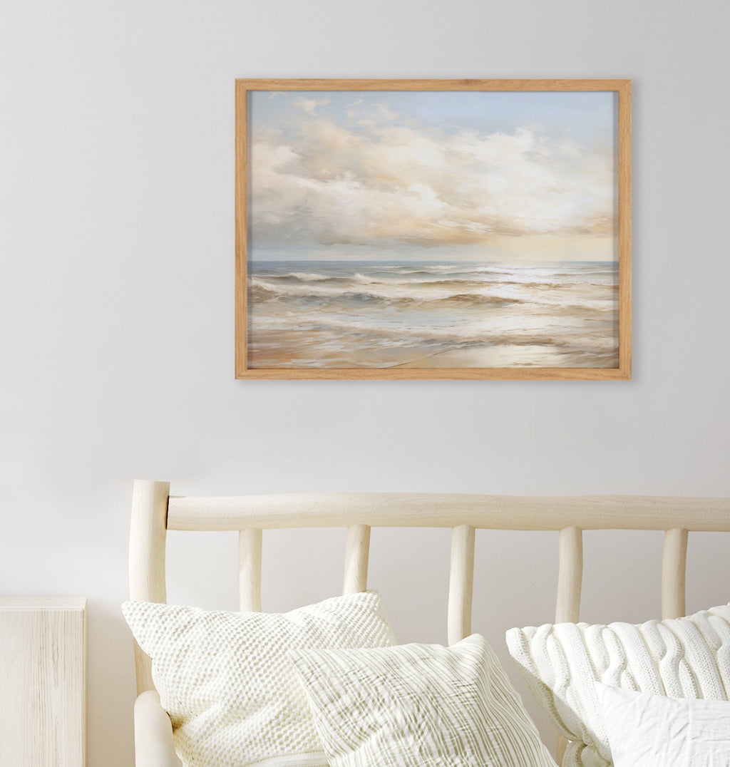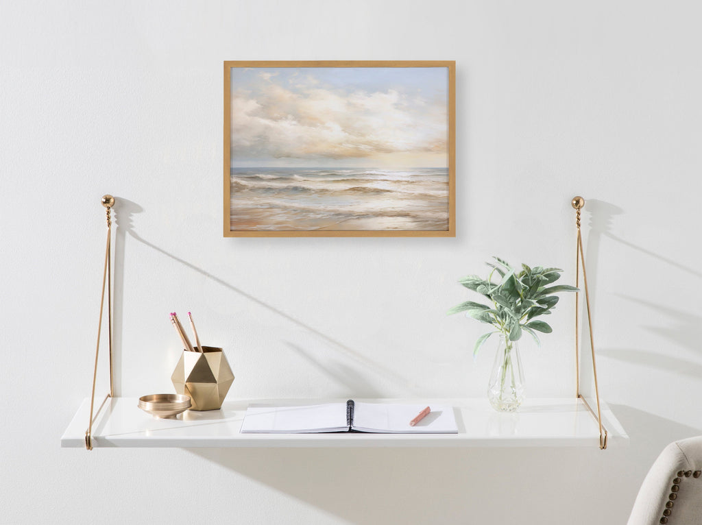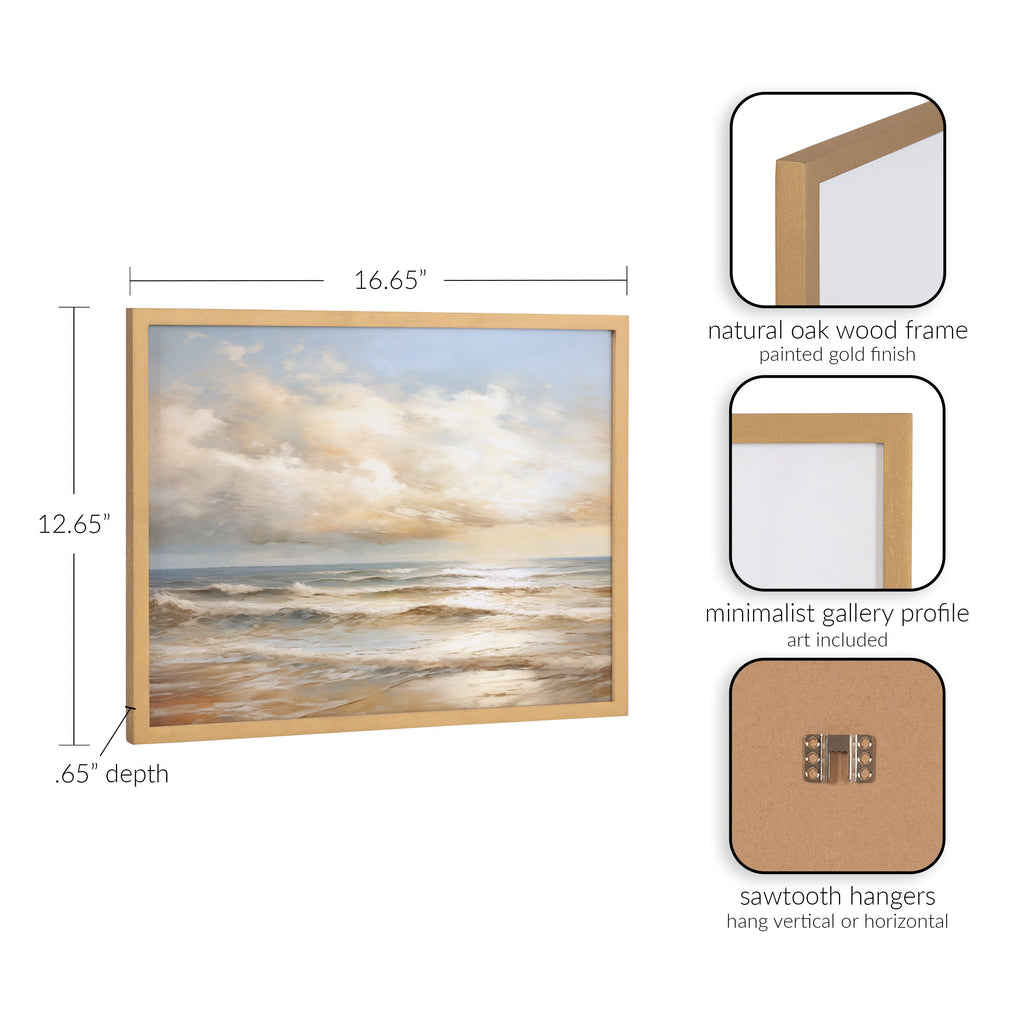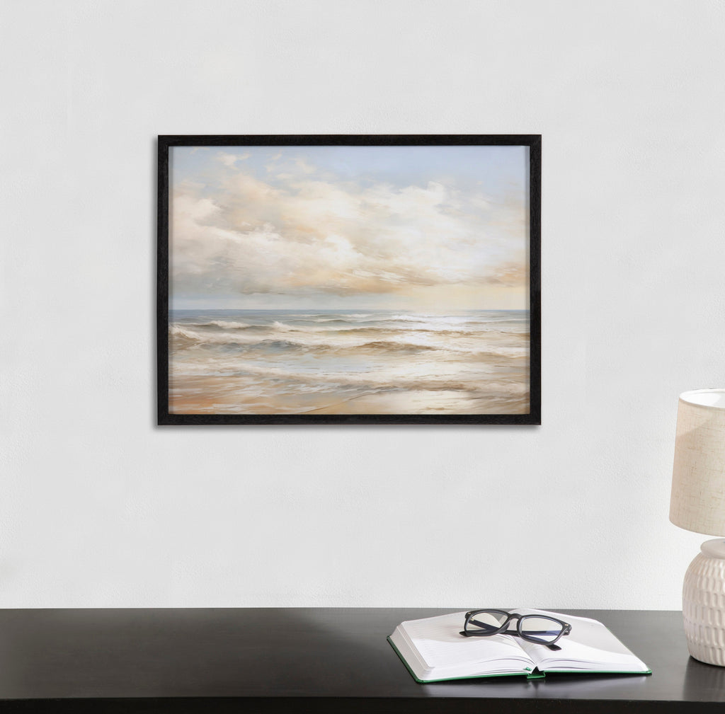 Featuring a serene sunset over gentle waves, this artwork evokes a peaceful beachscape. Printed in the USA in Waunakee, Wisconsin, this modern framed wall art is sure to bring joy to your space. Our design team curates art that will fit perfectly in any room of your home. Printed on semi-gloss paper made of responsibly sourced wood fibers and framed with a simple solid wood gallery frame, this wall art is easy to display on the wall and will match any décor style. Showcase this curated art in your living room, bedroom, home office, kitchen, bathroom, nursery, or anywhere you want to bring a little beauty and charm to your walls. Specializing in home décor, we are continually bringing timeless works of art for the traditional decorator as well as trend-forward pieces for that eclectic art lover. Our high-quality framed wall art also makes excellent gifts for birthdays, holidays, or housewarming parties.
