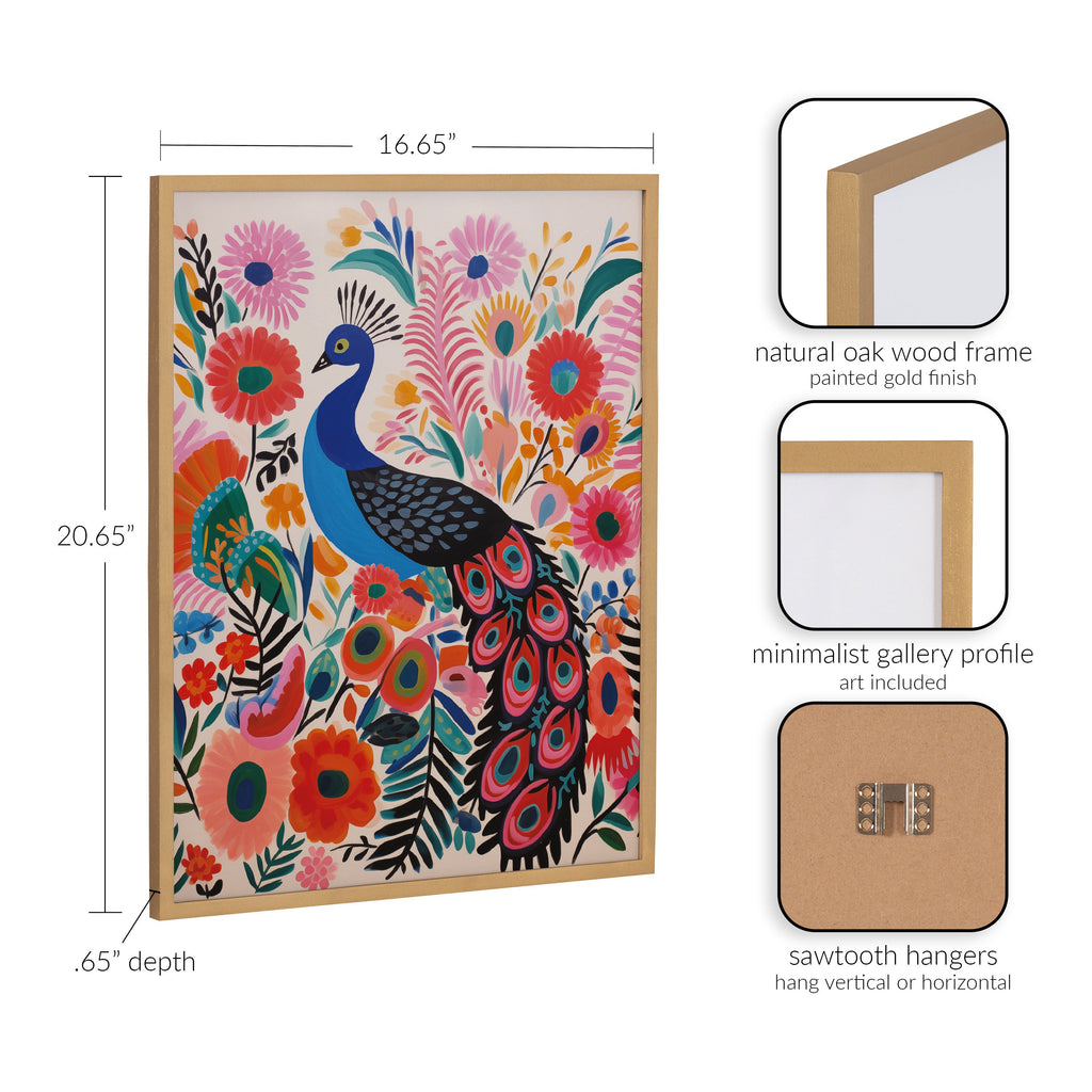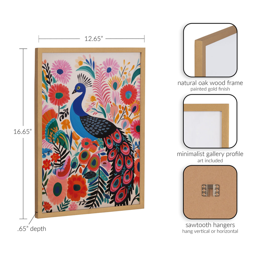 A bright and colorful peacock is the highlight of this modern boho artwork. Printed in the USA in Waunakee, Wisconsin, this modern framed wall art is sure to bring joy to your space. Our design team curates art that will fit perfectly in any room of your home. Printed on semi-gloss paper made of responsibly sourced wood fibers and framed with a simple solid wood gallery frame, this wall art is easy to display on the wall and will match any décor style. Showcase this curated art in your living room, bedroom, home office, kitchen, bathroom, nursery, or anywhere you want to bring a little beauty and charm to your walls. Specializing in home décor, we are continually bringing timeless works of art for the traditional decorator as well as trend-forward pieces for that eclectic art lover. Our high-quality framed wall art also makes excellent gifts for birthdays, holidays, or housewarming parties.