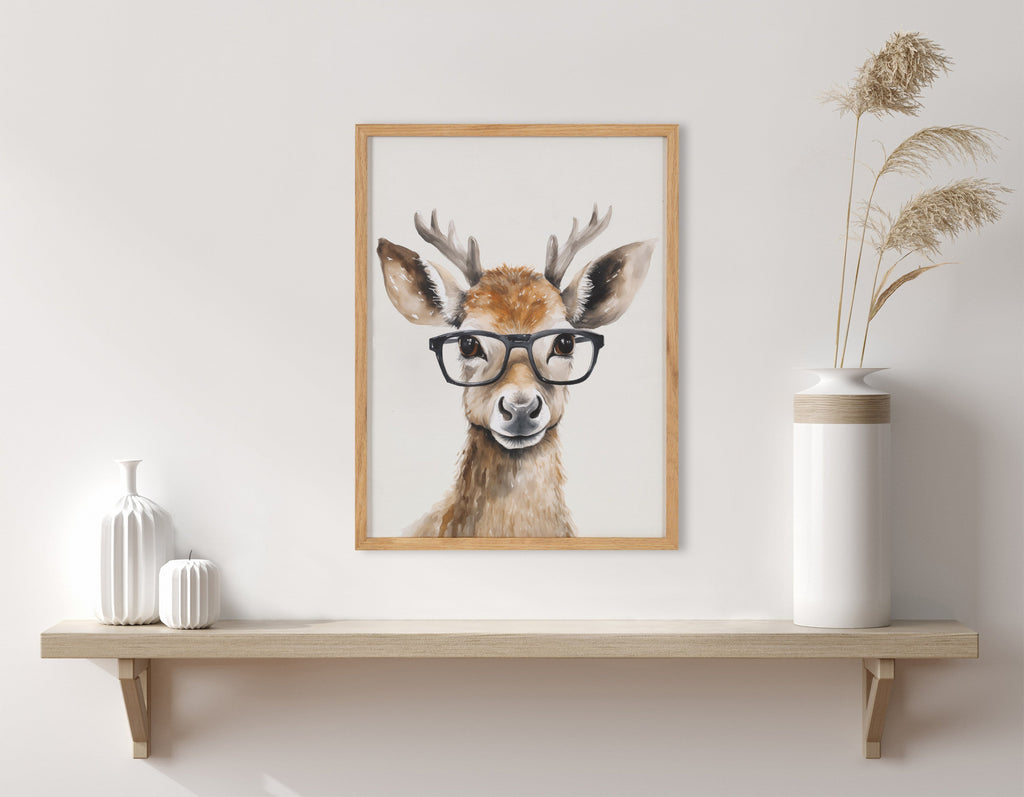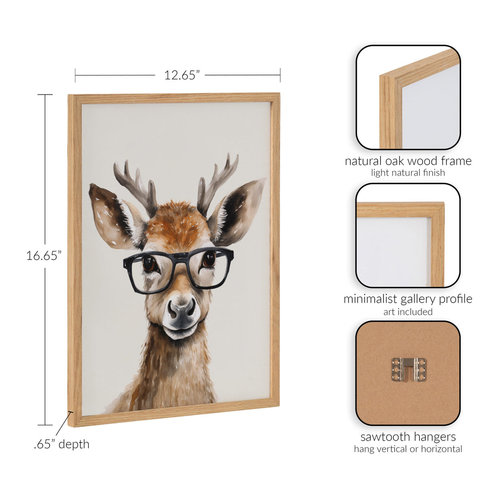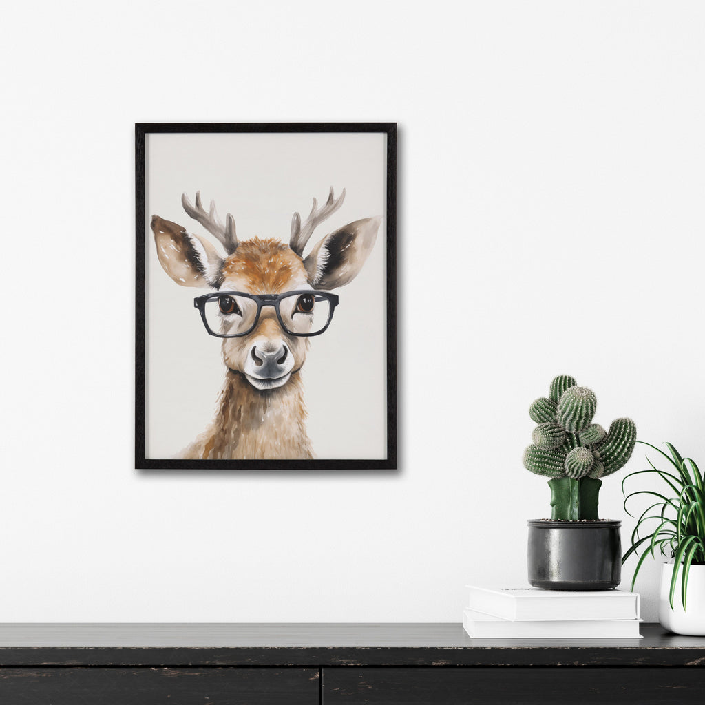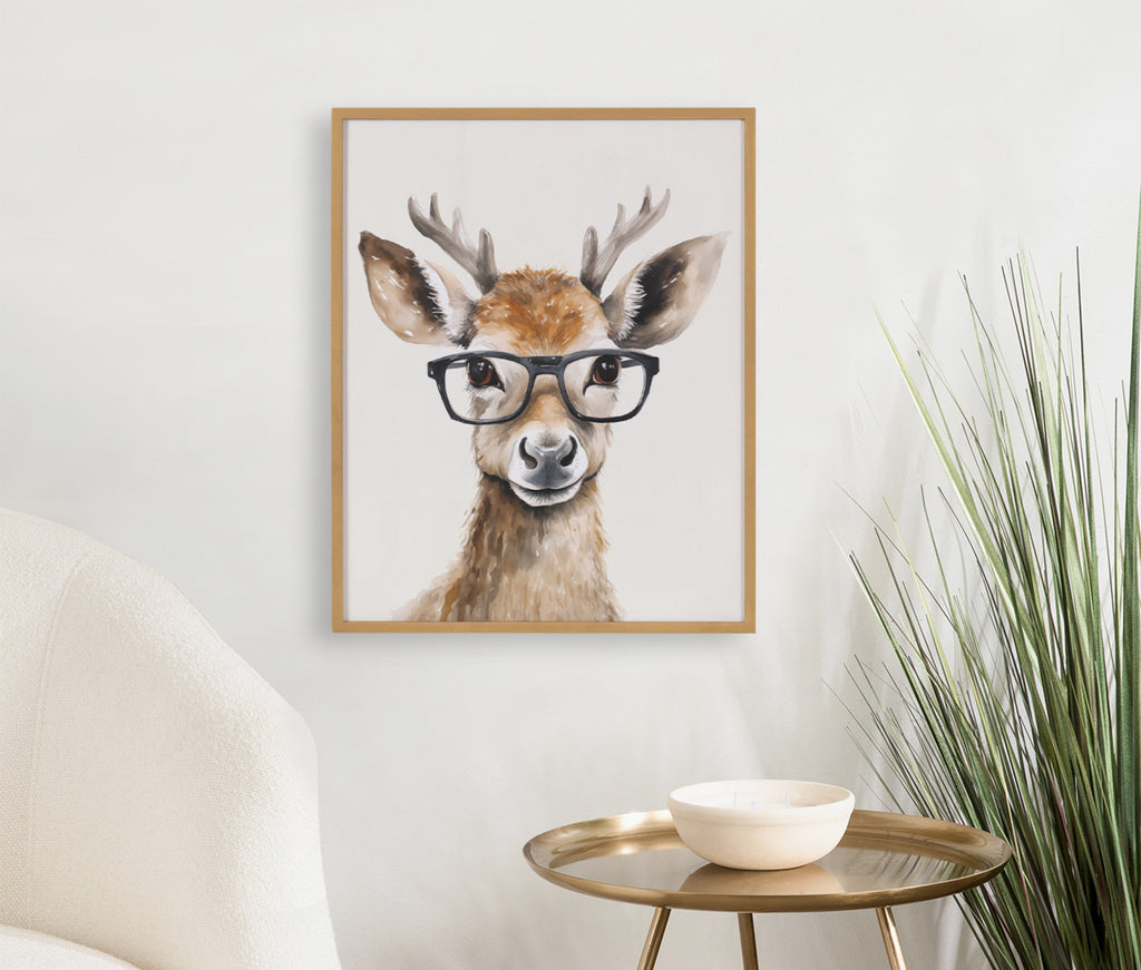 This artwork features an adorable deer wearing glasses, adding a touch of whimsy and charm to your decor. Printed in the USA in Waunakee, Wisconsin, this modern framed wall art is sure to bring joy to your space. Our design team curates art that will fit perfectly in any room of your home. Printed on semi-gloss paper made of responsibly sourced wood fibers and framed with a simple solid wood gallery frame, this wall art is easy to display on the wall and will match any décor style. Showcase this curated art in your living room, bedroom, home office, kitchen, bathroom, nursery, or anywhere you want to bring a little beauty and charm to your walls. Specializing in home décor, we are continually bringing timeless works of art for the traditional decorator as well as trend-forward pieces for that eclectic art lover. Our high-quality framed wall art also makes excellent gifts for birthdays, holidays, or housewarming parties.
