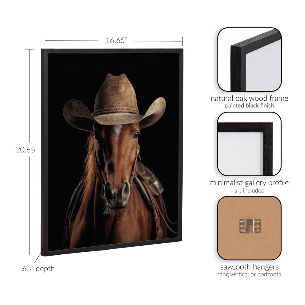 This modern artwork presents a playful depiction of a horse wearing a cowboy hat, ideal for adding a touch of western charm and personality to any room. Printed in the USA in Waunakee, Wisconsin, this modern framed wall art is sure to bring joy to your space. Our design team curates art that will fit perfectly in any room of your home. Printed on semi-gloss paper made of responsibly sourced wood fibers and framed with a simple solid wood gallery frame, this wall art is easy to display on the wall and will match any décor style. Showcase this curated art in your living room, bedroom, home office, kitchen, bathroom, nursery, or anywhere you want to bring a little beauty and charm to your walls. Specializing in home décor, we are continually bringing timeless works of art for the traditional decorator as well as trend-forward pieces for that eclectic art lover. Our high-quality framed wall art also makes excellent gifts for birthdays, holidays, or housewarming parties.