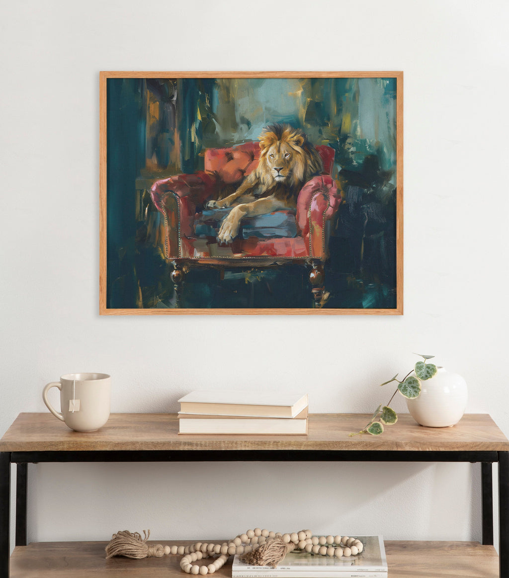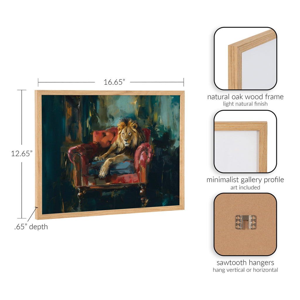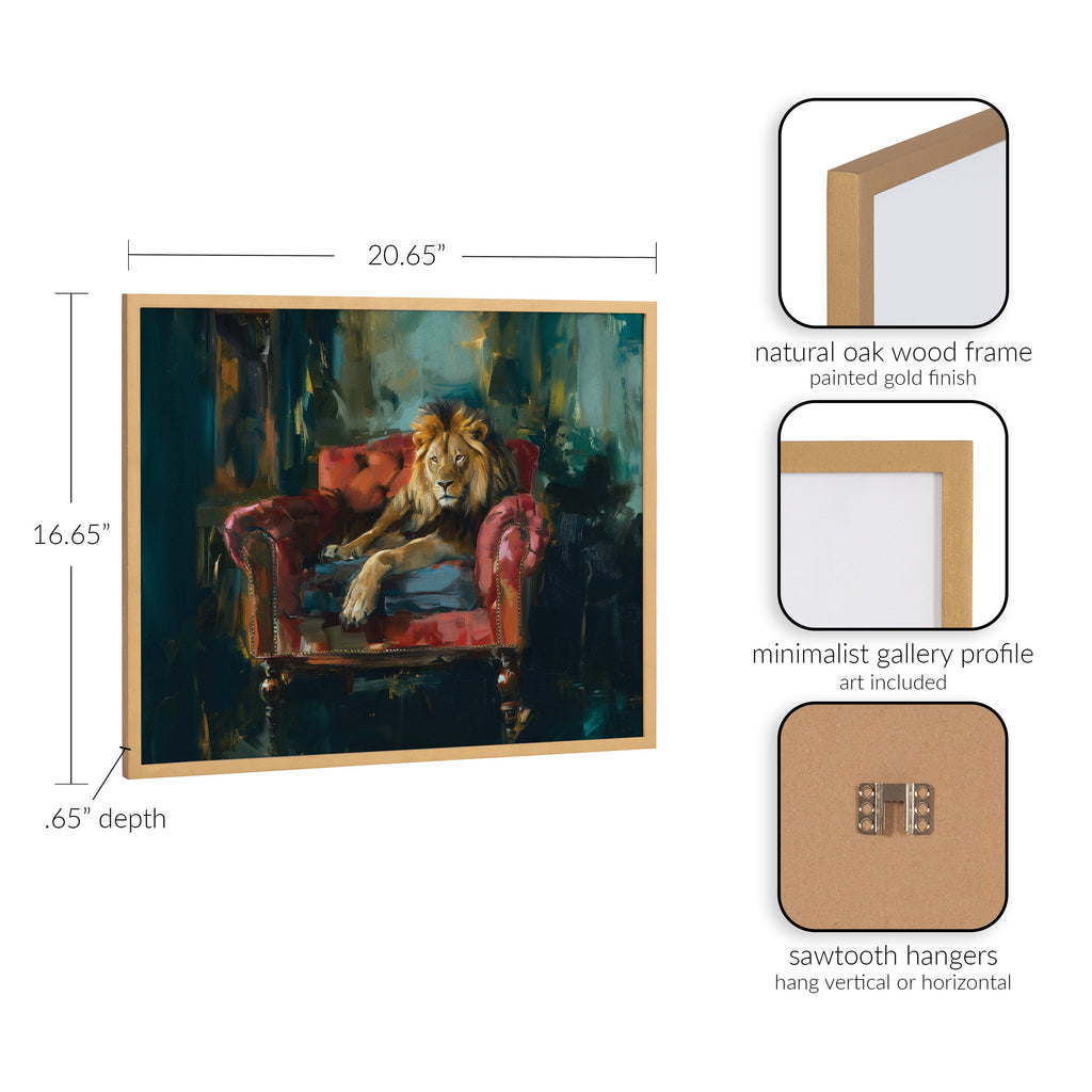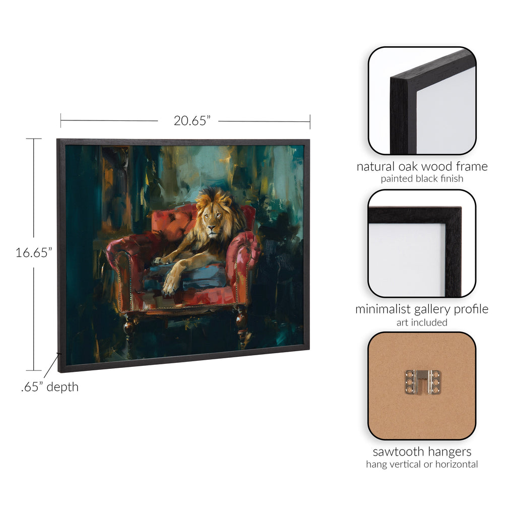 This majestic lion portrait showcases the king of the jungle in rich jewel tones, exuding power and elegance. Printed in the USA in Waunakee, Wisconsin, this modern framed wall art is sure to bring joy to your space. Our design team curates art that will fit perfectly in any room of your home. Printed on semi-gloss paper made of responsibly sourced wood fibers and framed with a simple solid wood gallery frame, this wall art is easy to display on the wall and will match any décor style. Showcase this curated art in your living room, bedroom, home office, kitchen, bathroom, nursery, or anywhere you want to bring a little beauty and charm to your walls. Specializing in home décor, we are continually bringing timeless works of art for the traditional decorator as well as trend-forward pieces for that eclectic art lover. Our high-quality framed wall art also makes excellent gifts for birthdays, holidays, or housewarming parties.