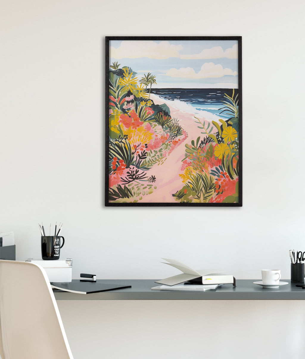 A bright tropical pathway leading to the ocean is the focus of this artwork. Printed in the USA in Waunakee, Wisconsin, this modern framed wall art is sure to bring joy to your space. Our design team curates art that will fit perfectly in any room of your home. Printed on semi-gloss paper made of responsibly sourced wood fibers and framed with a simple solid wood gallery frame, this wall art is easy to display on the wall and will match any décor style. Showcase this curated art in your living room, bedroom, home office, kitchen, bathroom, nursery, or anywhere you want to bring a little beauty and charm to your walls. Specializing in home décor, we are continually bringing timeless works of art for the traditional decorator as well as trend-forward pieces for that eclectic art lover. Our high-quality framed wall art also makes excellent gifts for birthdays, holidays, or housewarming parties.