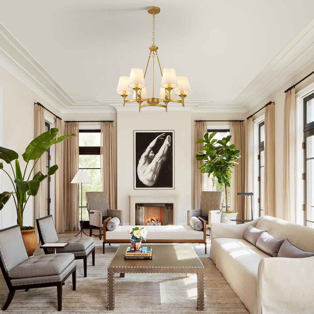 - Six-light gold round chandelier with white fabric shades for soft, even illumination.