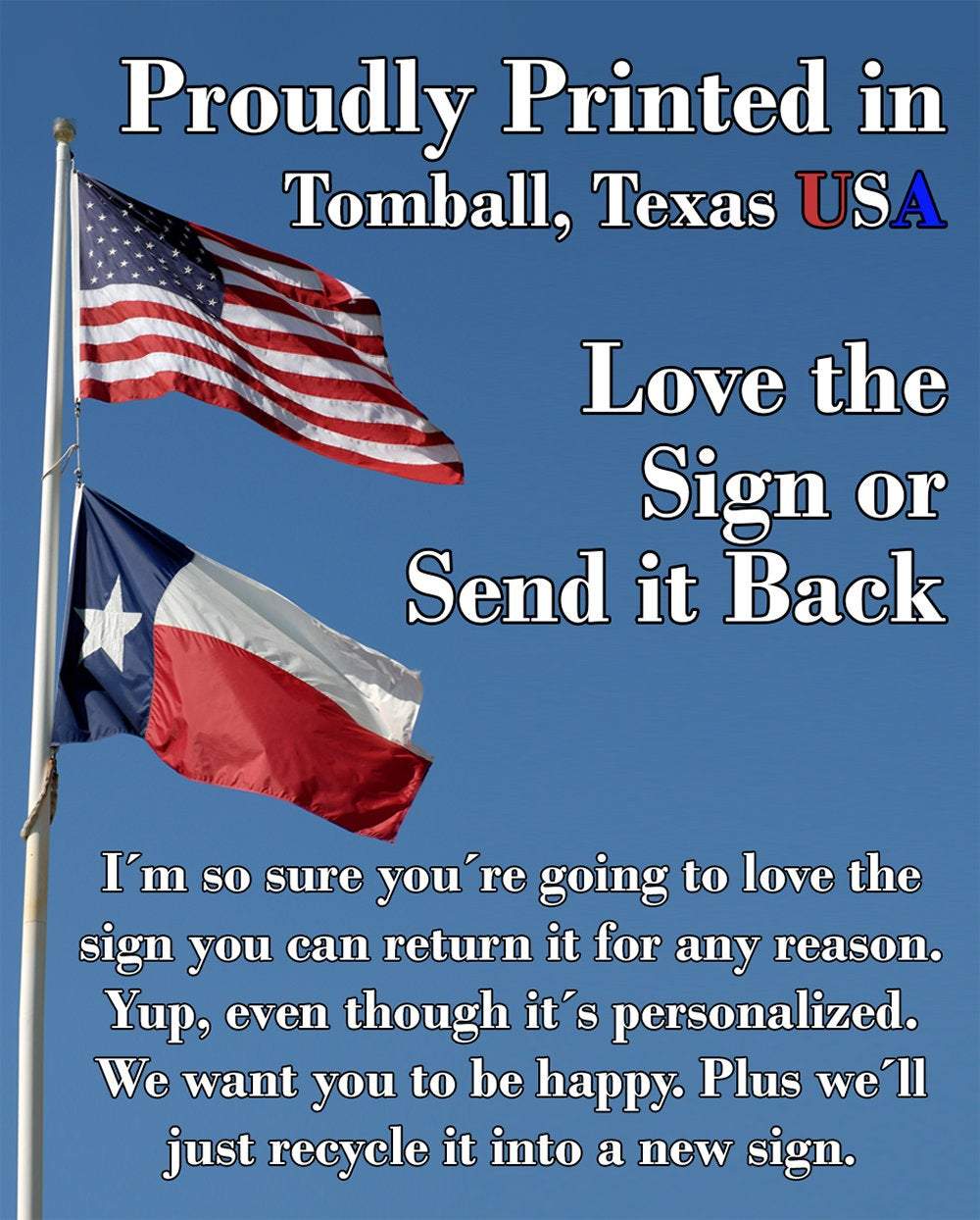 Guarantee - I'm so sure you're going to love the sign. Made in the USA (Tomball, Texas) in our family-owned shop
