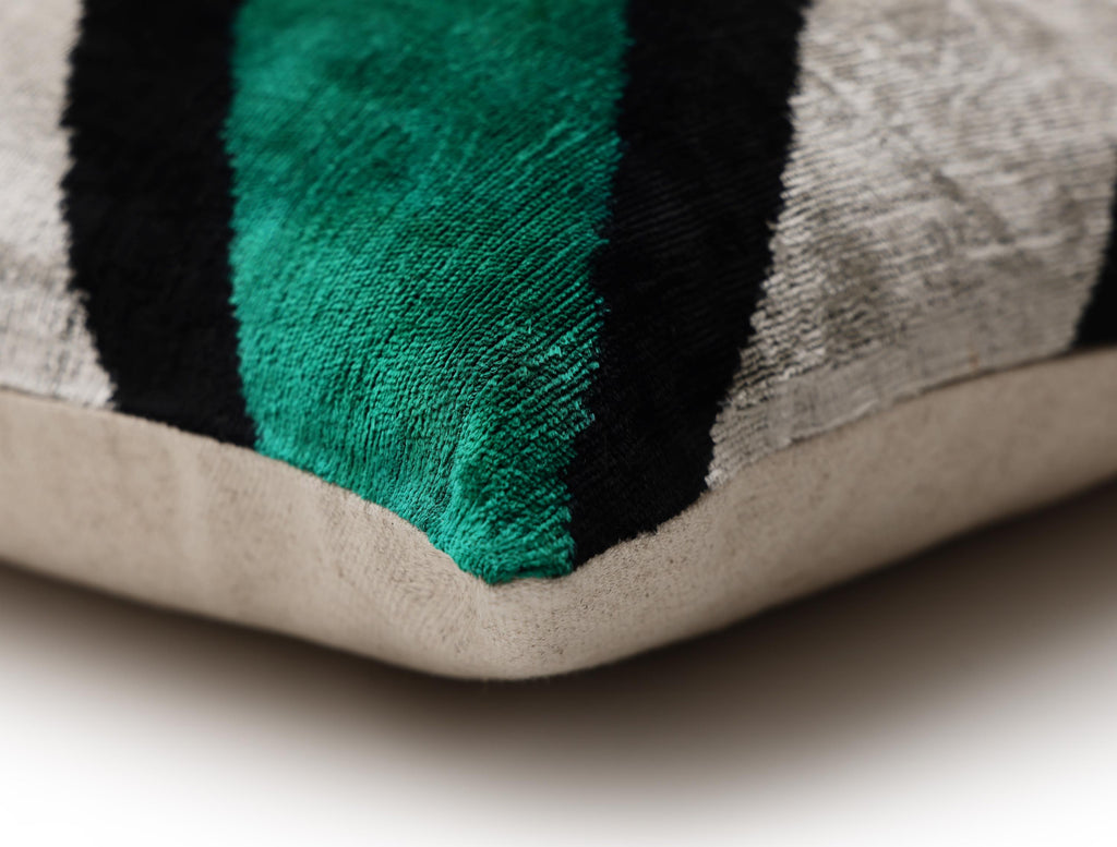 The design features a graphic chevron motif in deep emerald green, soft ivory, and jet black. The contrast feels architectural yet warm, making it a standout accent without overpowering the space. Each pillow is carefully finished and tailored in our California atelier, ensuring precise stitching, clean edges, and a luxurious final form.