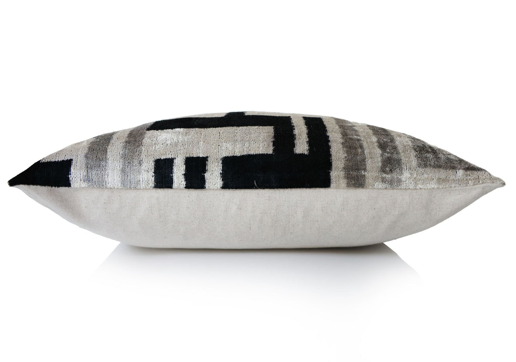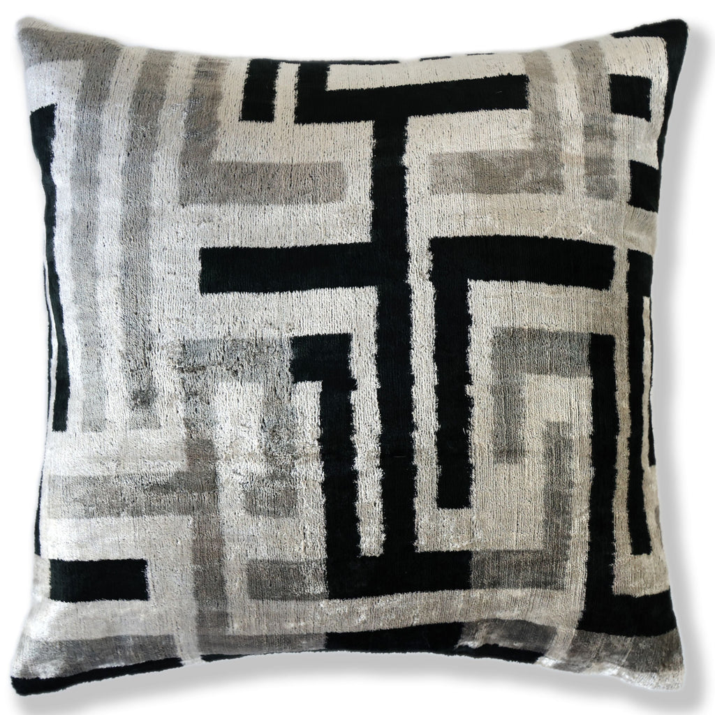 This 20x20 square pillow features a bold, labyrinthine pattern that channels Brutalist architecture and Art Deco geometry. Hand-woven and hand-knotted using organic vegetable dyes, the design contrasts deep ink black velvet against a luminous background of silver-grey and oyster. The "blurred" edges of the ikat technique soften the graphic lines, giving the pillow a sense of movement and hand-crafted soul rather than rigid machine perfection.