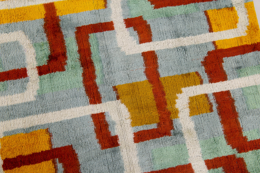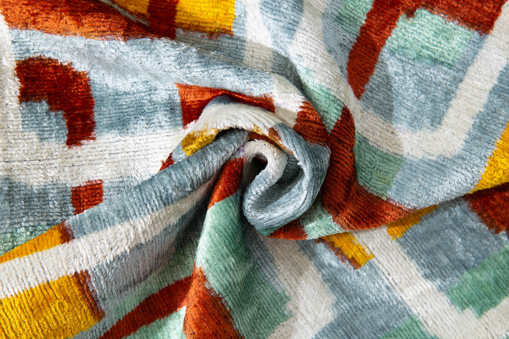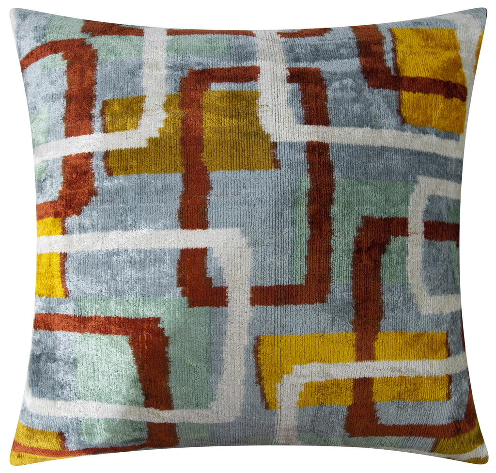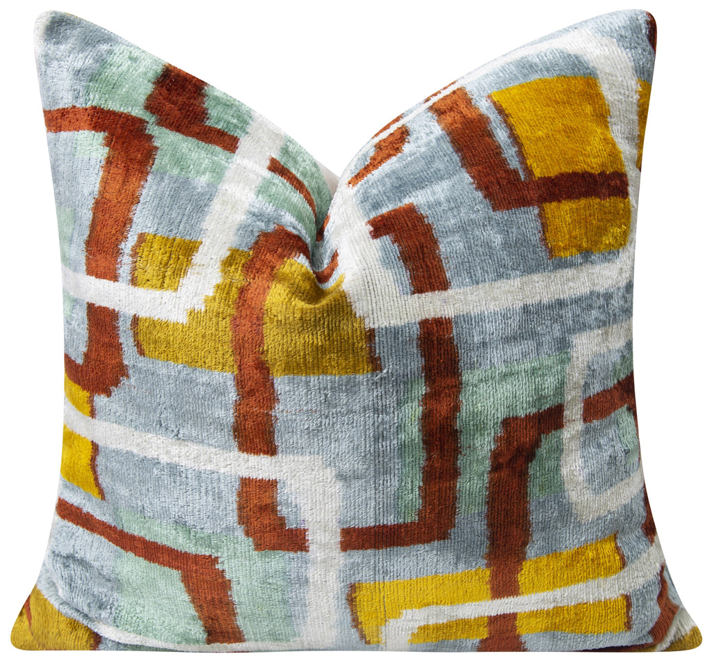 Enhance your home decor with this luxurious handmade silk velvet throw pillow, featuring a vibrant geometric design in burnt orange, mustard yellow, soft mint green, and gray-blue. Measuring 20x20 inches, this striking pillow adds a modern, artistic touch to any living room, bedroom, or office space. The rich silk velvet fabric, vegetable-dyed for a deep, natural finish, creates a beautiful, soft texture that complements the bold colors. Complete with a premium down feather insert for unmatched comfort, this pillow also includes a hidden zipper for easy removal and cleaning. The back of the pillow is crafted from durable linen, providing a subtle contrast and long-lasting quality. Whether you're looking to update your contemporary or mid-century decor, this geometric throw pillow is the perfect statement piece.