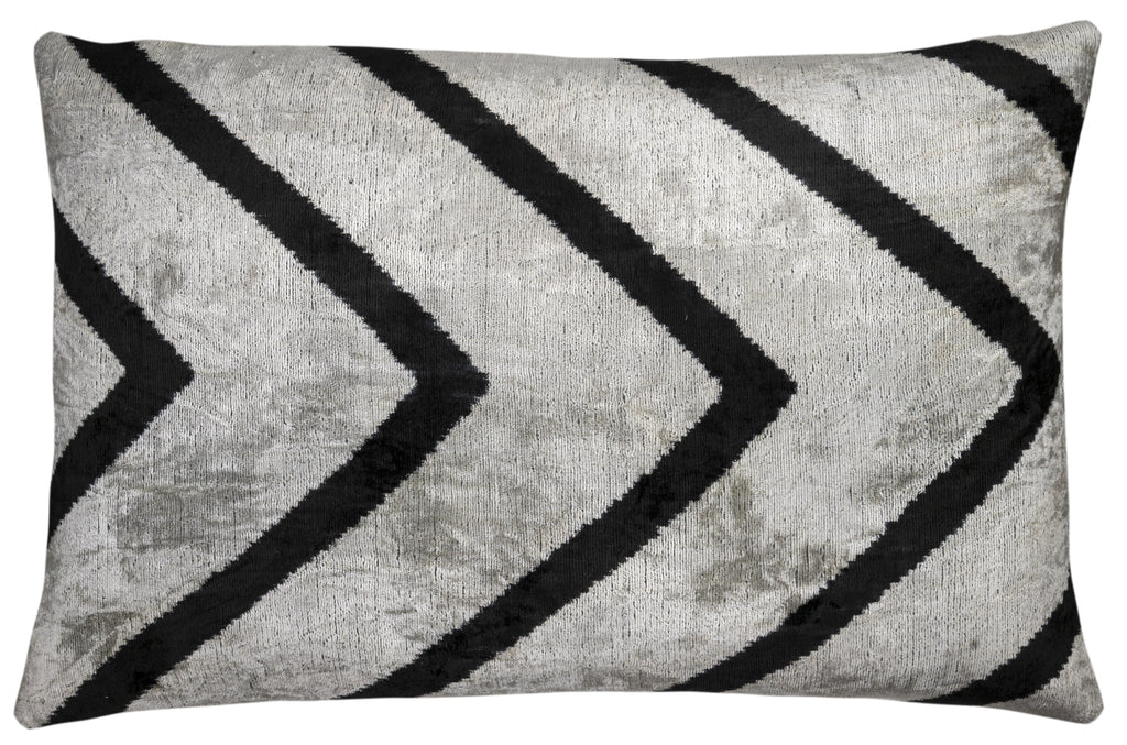 Add an edge of sophistication and drama to your space with this handmade velvet pillow, crafted with a bold black chevron pattern on a shimmering silver-gray backdrop. The minimalist design exudes modern elegance while maintaining the soft, tactile appeal of artisan velvet.