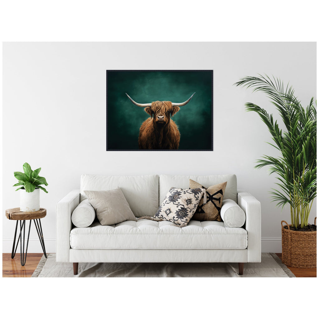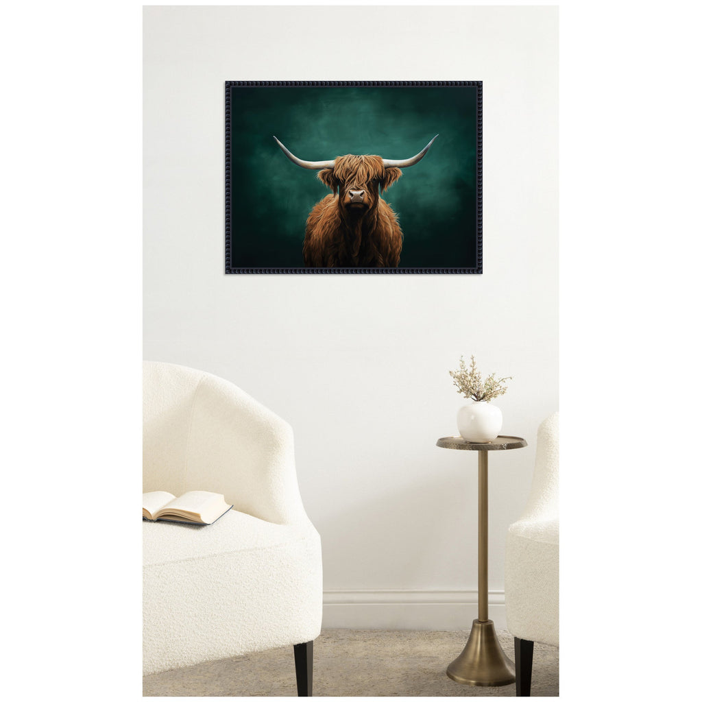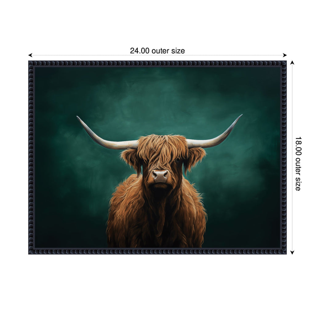 - Gallery Quality Art: Measuring 42 x 32 inches, this is beautifully presented in Sylvie Beaded Black frame - a vintage float frame featuring a traditionally beaded ornate design with black coloring, subtle antiquing and dramatic depth.. Expressive Wall Art Story:This artwork features a majestic Highland cow with long, shaggy hair and impressive curved horns. The cow is set against a rich, dark background that highlights its earthy brown tones. The expressive gaze and detailed texture create a powerful and captivating portrait.