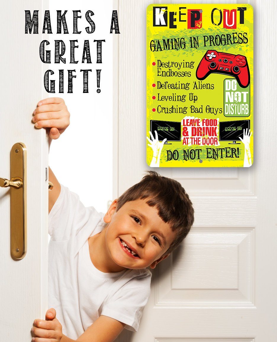 Metal Sign - Keep Out Gamer - Durable Metal Sign - 8" x 12" or 12" x 18" Use Indoor/Outdoor - Perfect Game Room and Man Cave Decor The Perfect Gift - A truly unique gift guaranteed to bring a smile Durable - 8" x 12" or 12" x 18" Aluminum metal sign printed with epoxy ink so you can proudly hang it inside or outside Easy to Hang - Comes with two screw holes and it's light enough to be mounted with double-sided foam tape or Command Strips. Guarantee - I'm so sure you're going to love the sign. Made in the USA (Tomball, Texas) in our family-owned shop