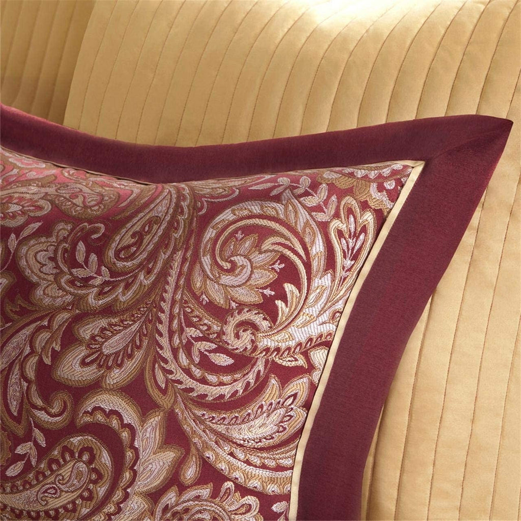 Give your mattress a magnificent makeover with this King 12 Piece Cotton Polyester Comforter Set Red Gold Paisley! Set includes 1 Comforter, 2 Decorative Pillows, 2 Euro Shams, 2 King Shams, 1 Bed skirt, 1 Flat Sheet, 1 Fitted Sheet, and 2 Pillowcases. Has a silky feel and is made from Polyester & Cotton. Set is in Eastern King (standard king) size and ships via FedEx Ground.