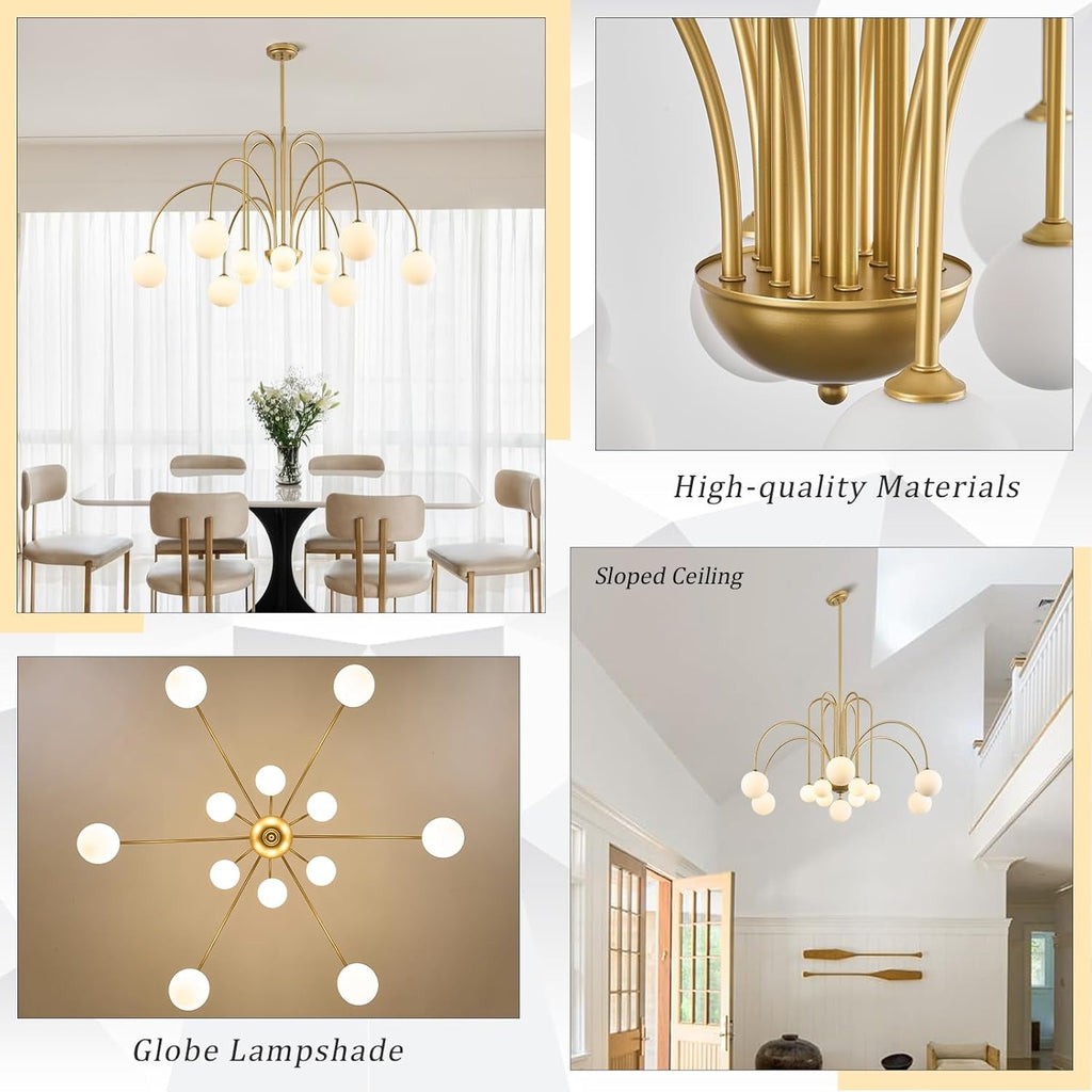 Make a bold statement with the Gold Sputnik Chandelier—52 inches of radiant, mid-century modern glamour that blends striking design with everyday practicality. Twelve textured milk-white glass shades soften the light for a warm, inviting glow, while the luminous gold finish adds timeless sophistication to any space.
