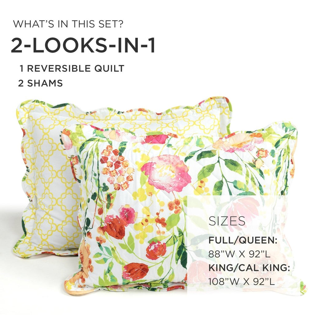 Brighten your bedroom with the floral pattern of our Leilani Watercolor Scallop Edged Floral 3 Piece Quilt Set. This bright watercolor print embodies the spirit of spring and summer with a gorgeous array of blooming botanicals.