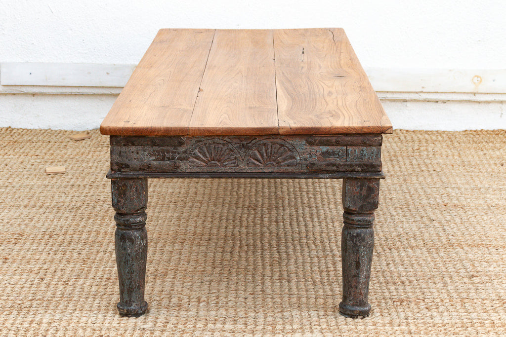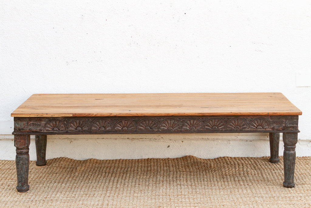 A grand example of colonial-era carpentry, this expansive low table was likely originally used as a Takhat or a low seating platform in a formal Indian residence. The long antique coffee table features a solid, single-plank (or tightly joined) teak top that has been scrubbed to a warm, natural honey tone, contrasting beautifully with the original dark, distressed paint on the base. The apron is embellished with a repeating carved "fan" or sunburst motif, a detail that hints at Art Deco influences merging with traditional Indian craftsmanship.