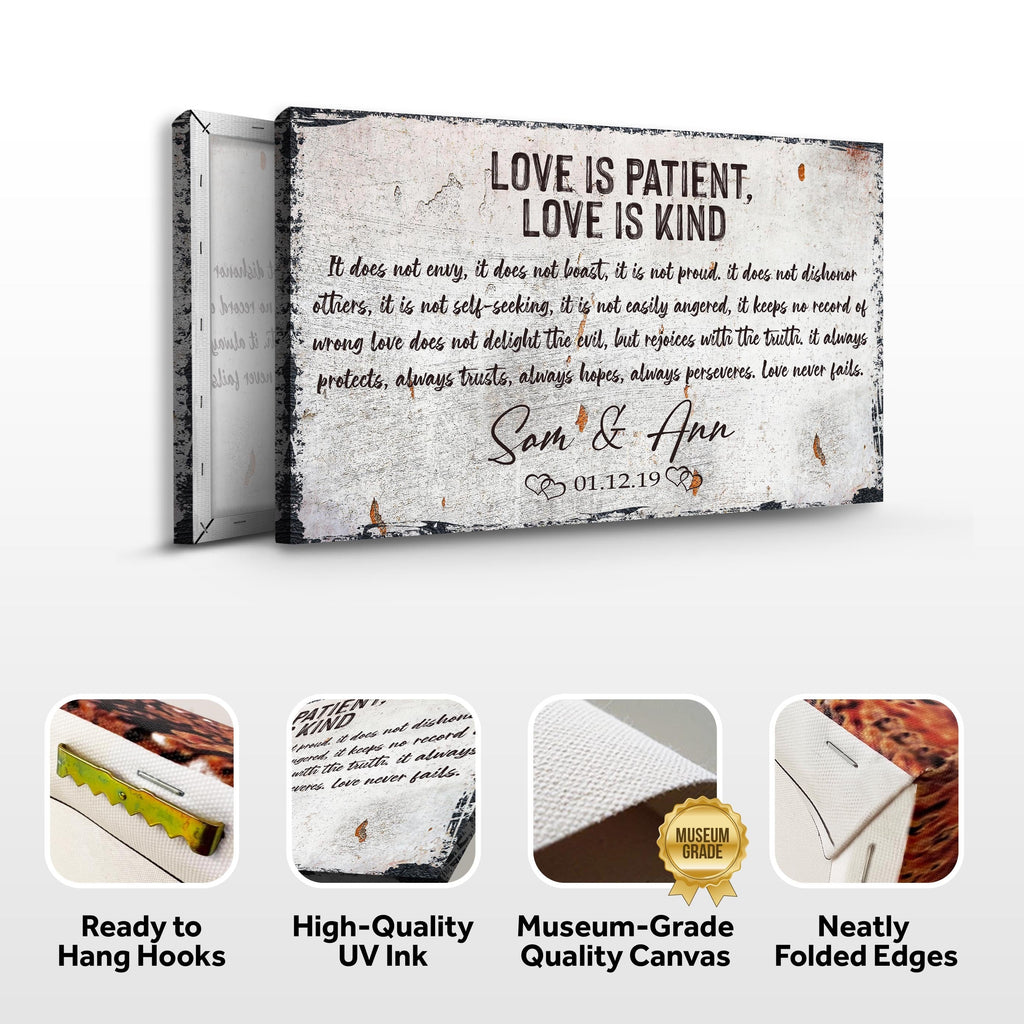 Love is a timeless sentiment that never loses its power to bring about joy and peace of mind. Love is also an ongoing process built on patience, kindness, understanding, and respect. A Love is Patient, Love is Kind canvas wall art offers the perfect way to remind your other half how much you treasure them each day. Not only does this stately piece make a stunning statement in any room of the house, but it also offers an opportunity to pause and reflect on how blessed we are to share our lives with those we care deeply for. In just one thoughtful gesture, you can show how much you appreciate your other half in ways words can't always express. If ever there were a lasting reminder of unconditional love and mutual admiration, Love is Patient Love is Kind canvas wall art does quite the job indeed.