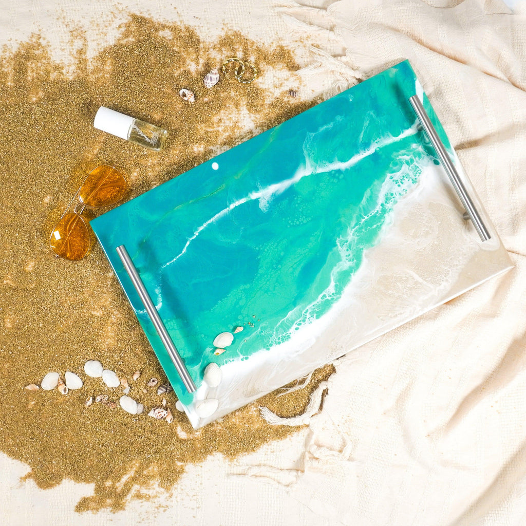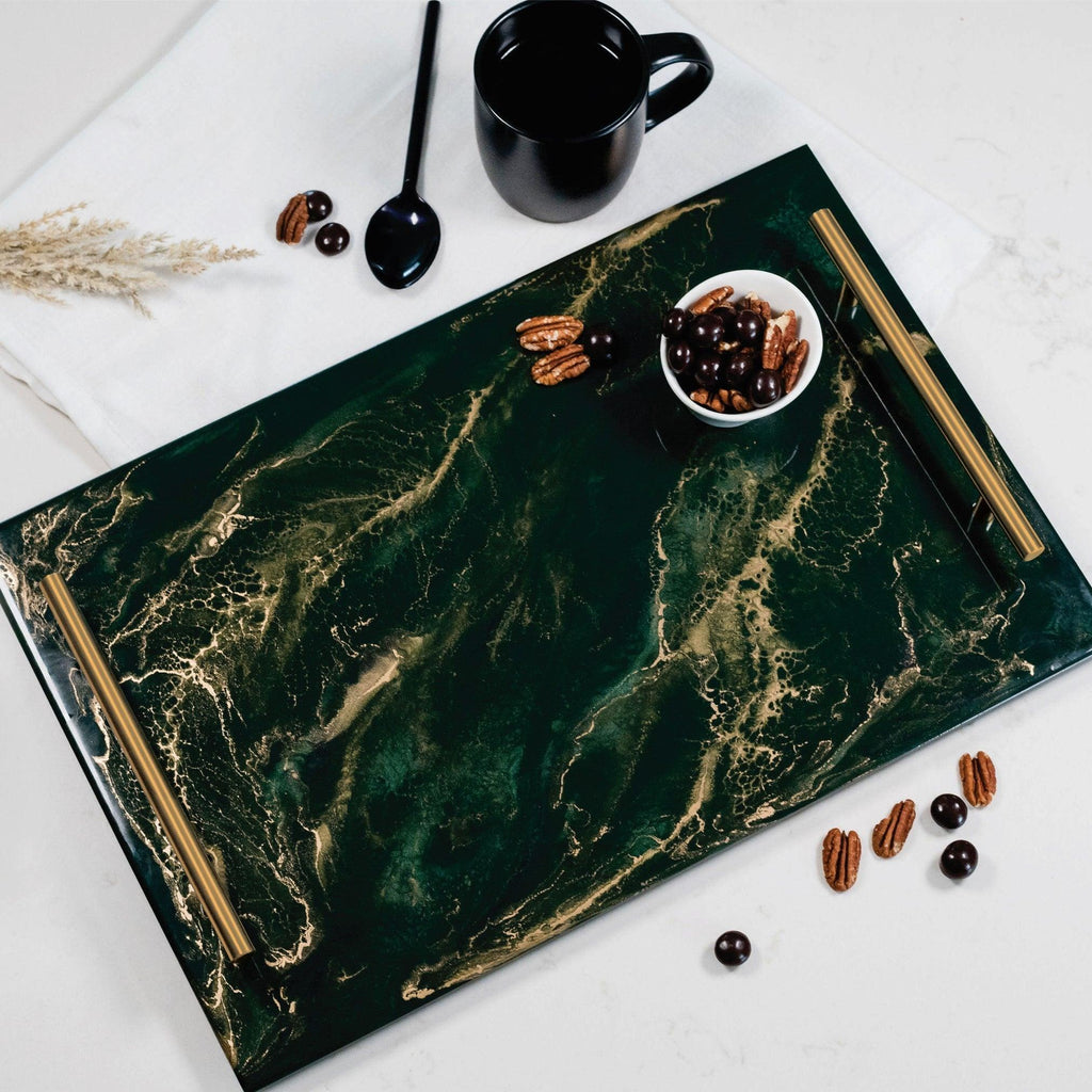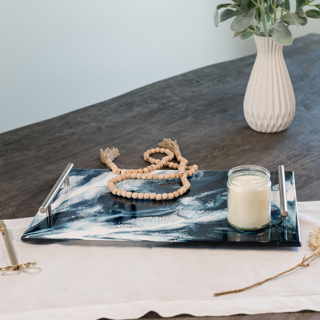 Wow your guests with one of our stunning Acrylic Serving Tray! Our serving trays are the perfect carrier for breakfast in bed, an overflowing charcuterie spread with a beautiful surprise underneath or a gorgeous accent piece for your living room or dining room! Your new tray will be the focal point to any room our event. It is 12" x 18" in diameter and comes with either silver or gold handles.