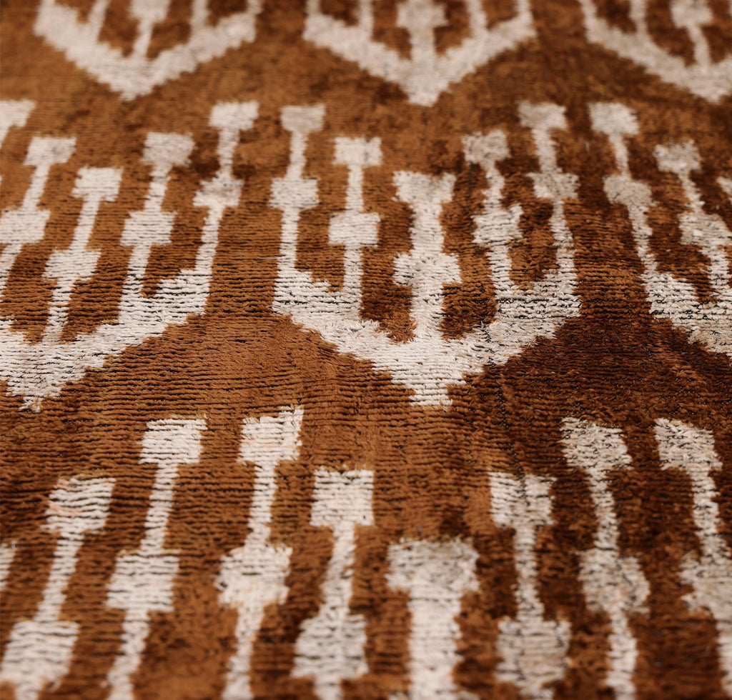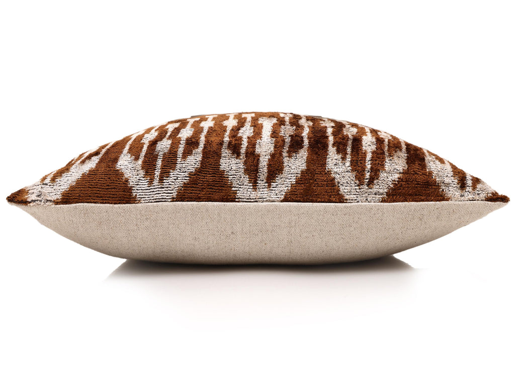 This luxury 20x20 inch handwoven silk velvet pillow is a statement accent designed for today’s most refined interiors. Featuring a rich earthy brown and soft ivory ikat pattern, this pillow brings warmth, depth, and artisanal character to both contemporary and classic spaces. Each piece is handwoven and hand knotted using organic, vegetable-dyed silk, resulting in subtle tonal variation and an heirloom-quality texture that designers value.