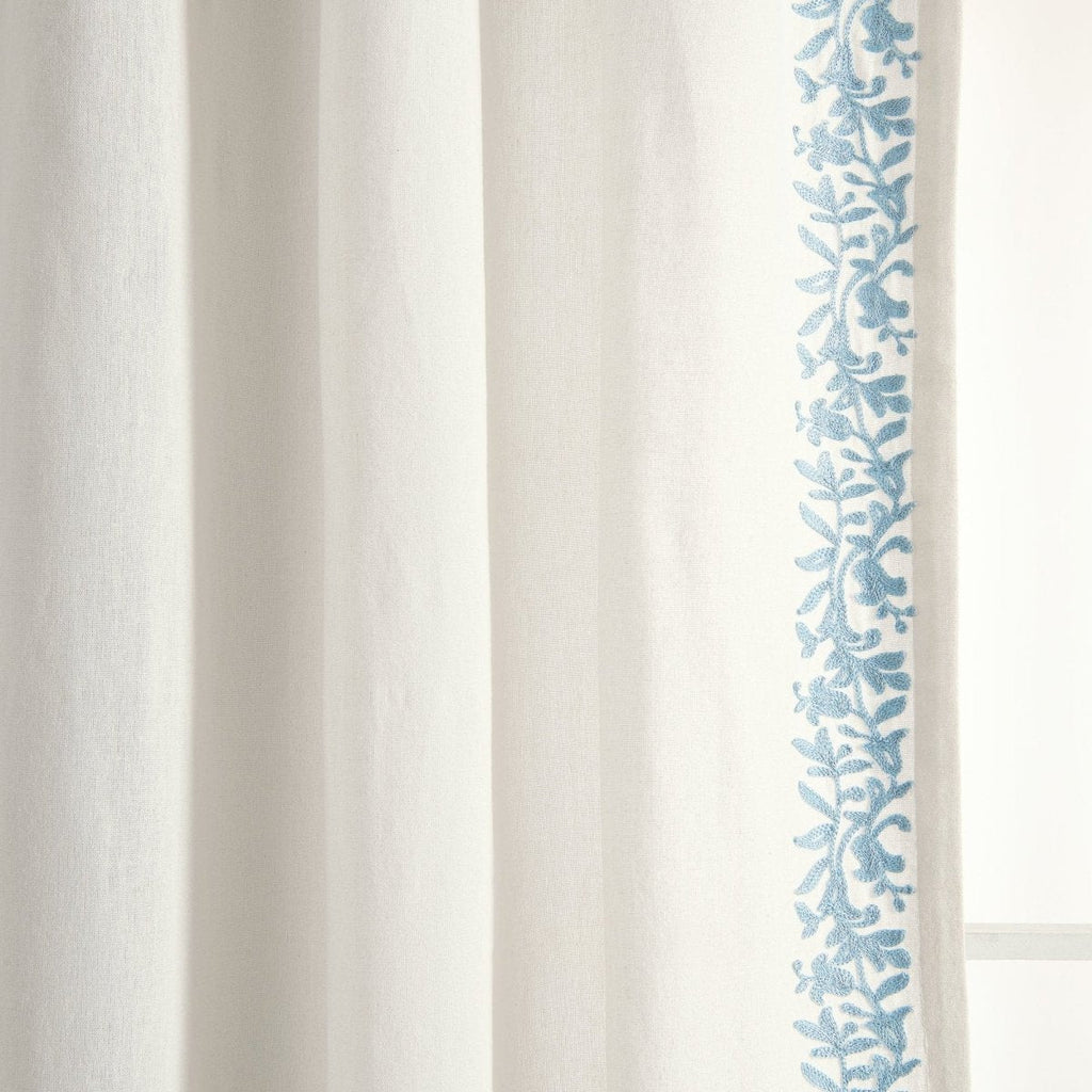 Trimmed with elegance and the texture of high quality faux linen, this Luxury Modern Flower Linen Like Embroidery Border Window Curtain Panel instantly frames your windows with an elevated style. The simple addition of color and pattern decorates your space with casual sophistication.