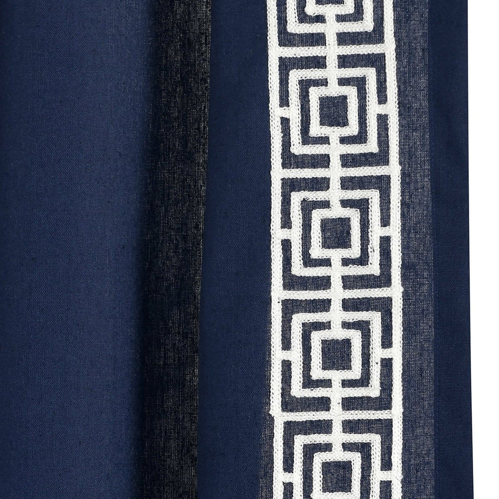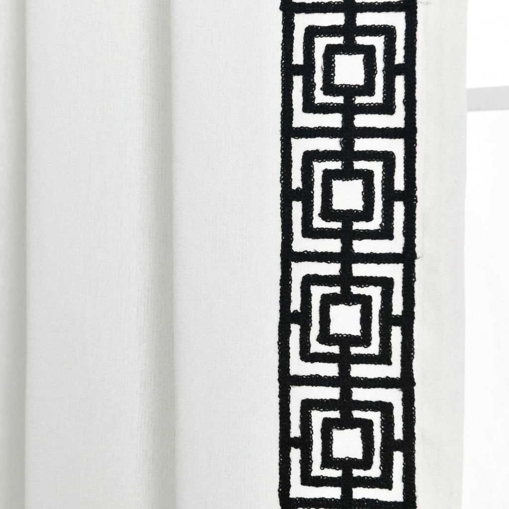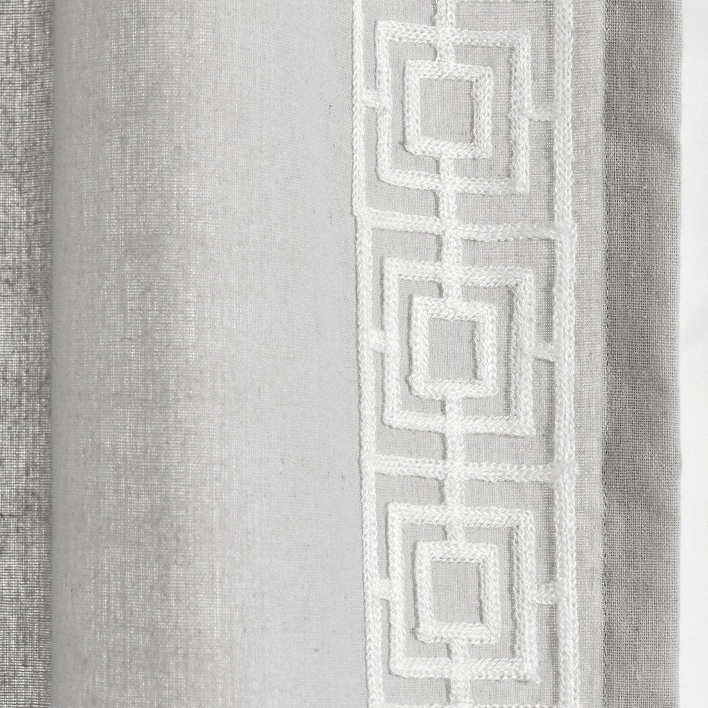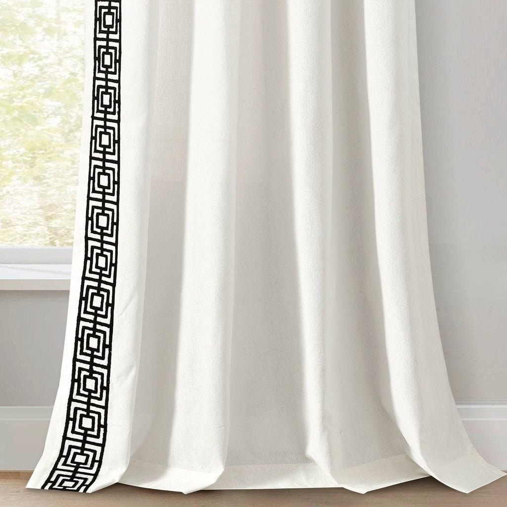 Showcase your luxurious taste with this Luxury Modern Square Embroidery Border Window Curtain Panel. The simple yet impactful look of the geometric embroidery in the modern detailed border enhances your space's style and frames your windows with a linen-like fabric.