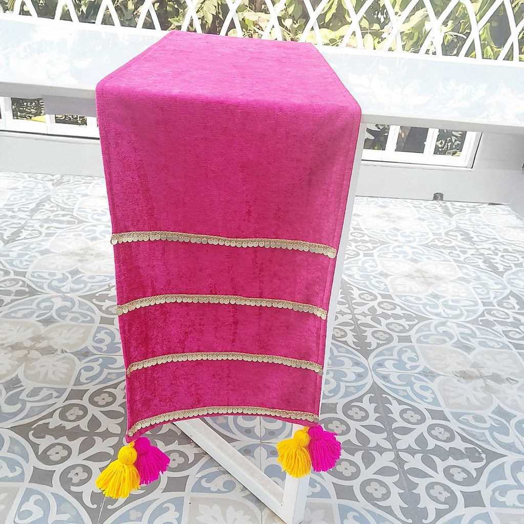 Add a touch of glamour and vibrant color to your table setting with this luxurious magenta velvet table runner. This stunning runner features shimmering gold sequin trim and playful tassels, creating a rich and inviting ambiance for any occasion.