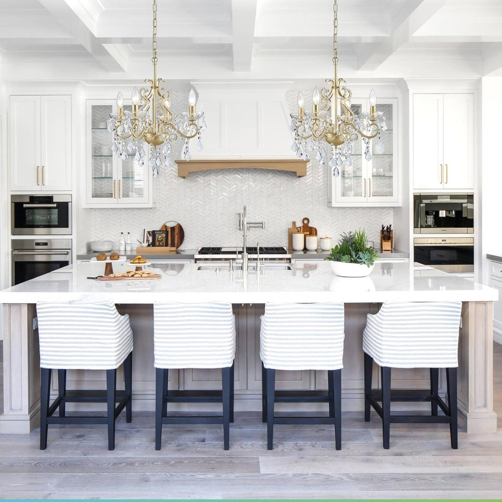 Crystal brilliance meets modern luxury — this 4-light gold pendant chandelier uses K9 crystal prisms that capture and refract light, creating a luminous, inviting atmosphere in living rooms, dining areas, bedrooms, and entryways.