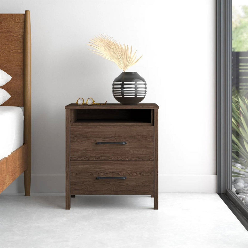 - Modern 2-Drawer Nightstand Bedside Table in Brown Walnut Wood Finish