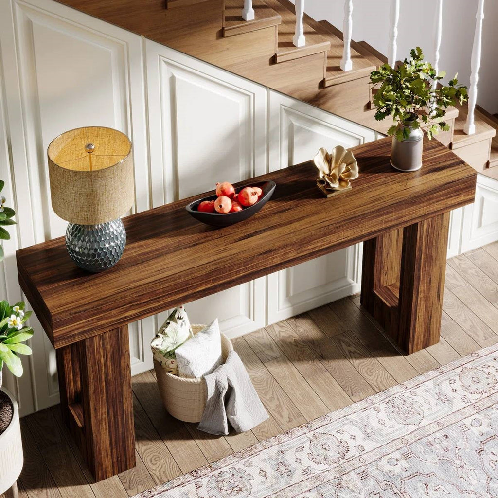 This Modern Farmhouse 63-inch Long Narrow Console Sofa Table in Brown Wood Finish embraces rustic charm, creating a warm, welcoming atmosphere. Its generous 63-inch length allows ample space for displaying decor, enhancing your home's character. Built from durable engineered wood, this table resists daily wear while its rich wood-like finish gives it an authentic, rustic appeal. The table's sleek design is enhanced by sturdy foot pads, ensuring stability and preventing wobbling, bringing both style and safety to your home. With its chic design, this console serves multiple purposes, be it as a foyer accent, a sofa table in the living room, or as a decorative piece in the hallway or dining area. Assembling is easy with our provided instructions, labeled parts, and necessary hardware. We back up your purchase with a one-year quality guarantee and lifetime customer service to ensure your satisfaction. (Note: The product in the images shows the color in an environment with sufficient light. If it is placed in a dark room, the color will be darker. Please choose the color according to your needs).