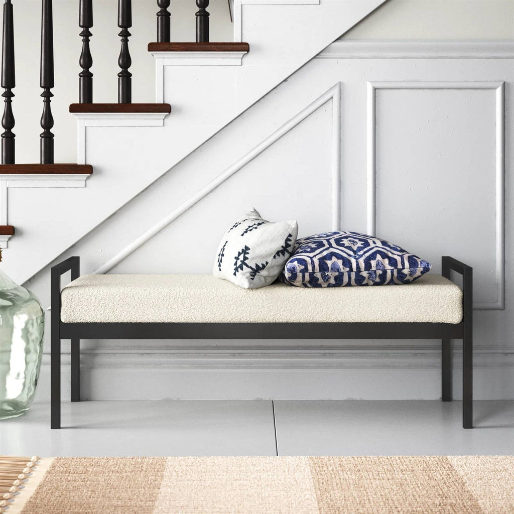 - Modern Industrial Bed Bench with Black Metal Frame and Cream Upholstered Cushion